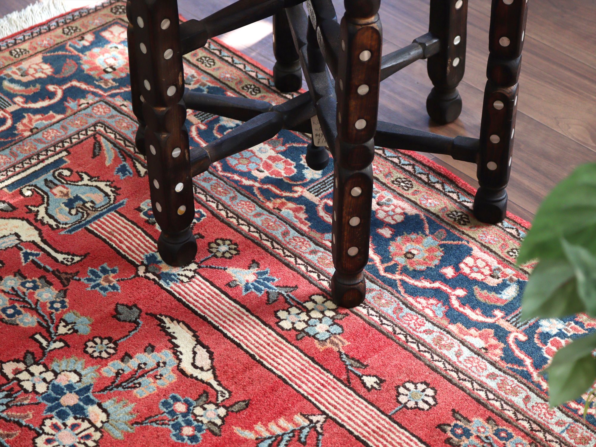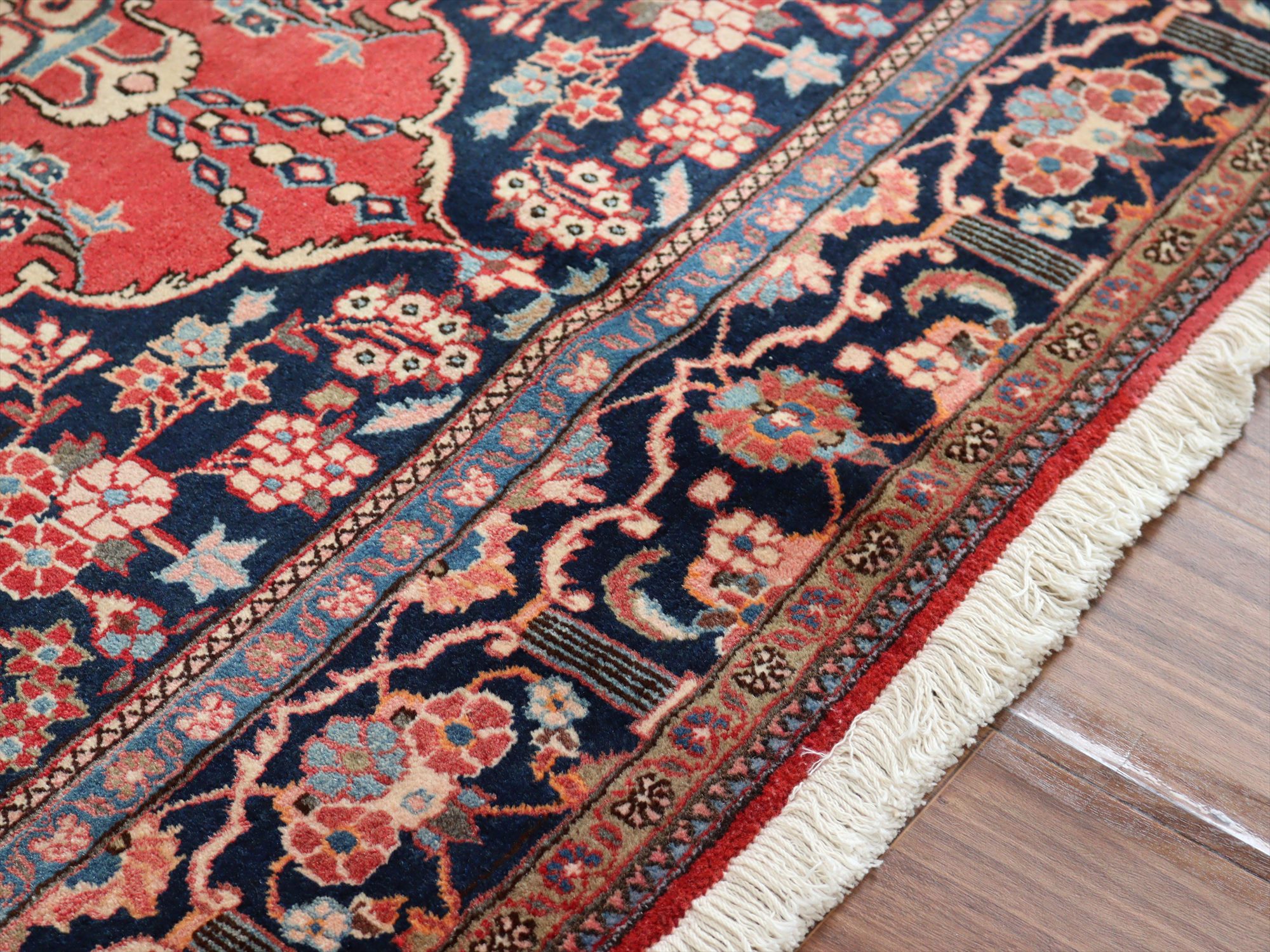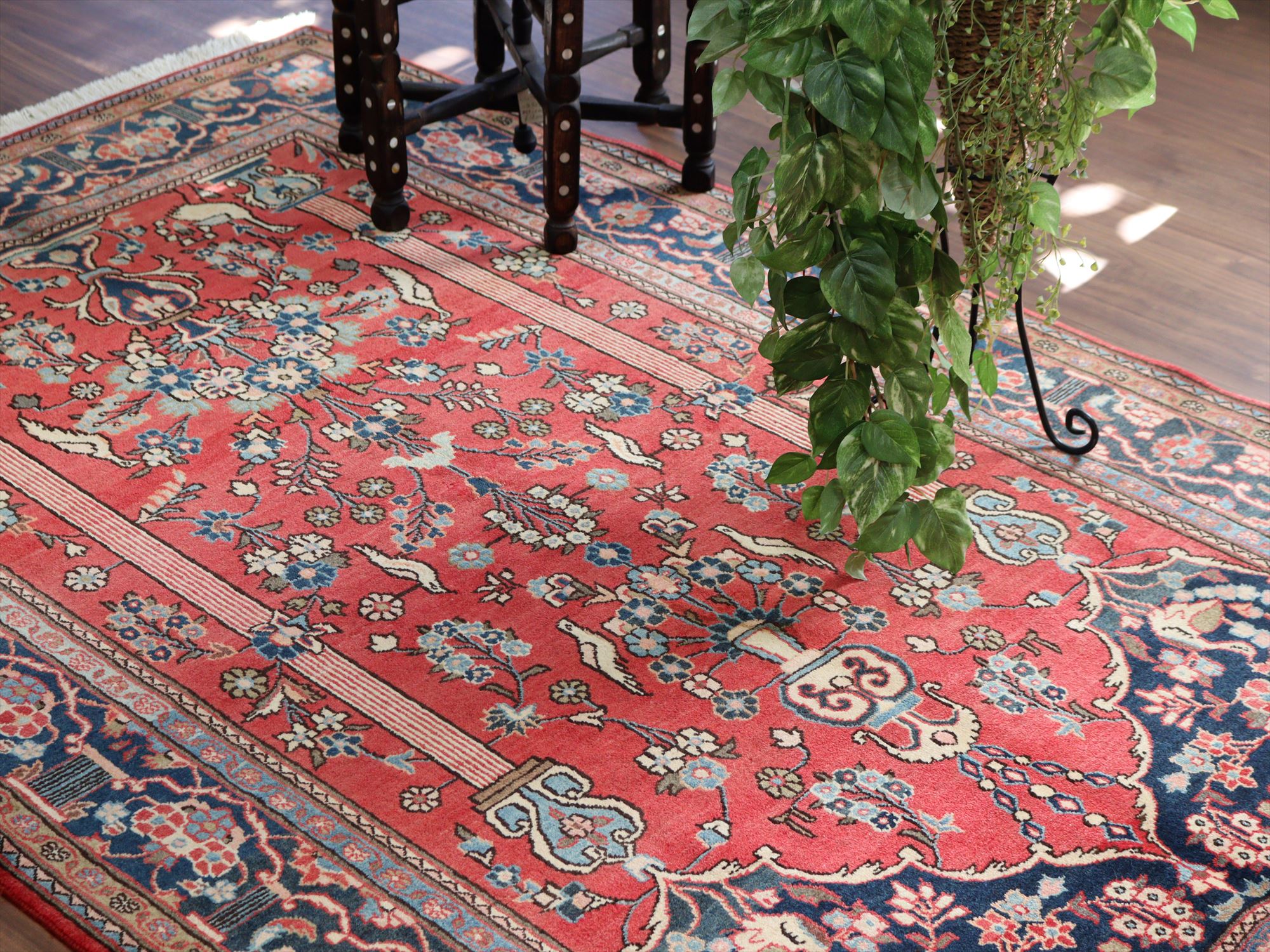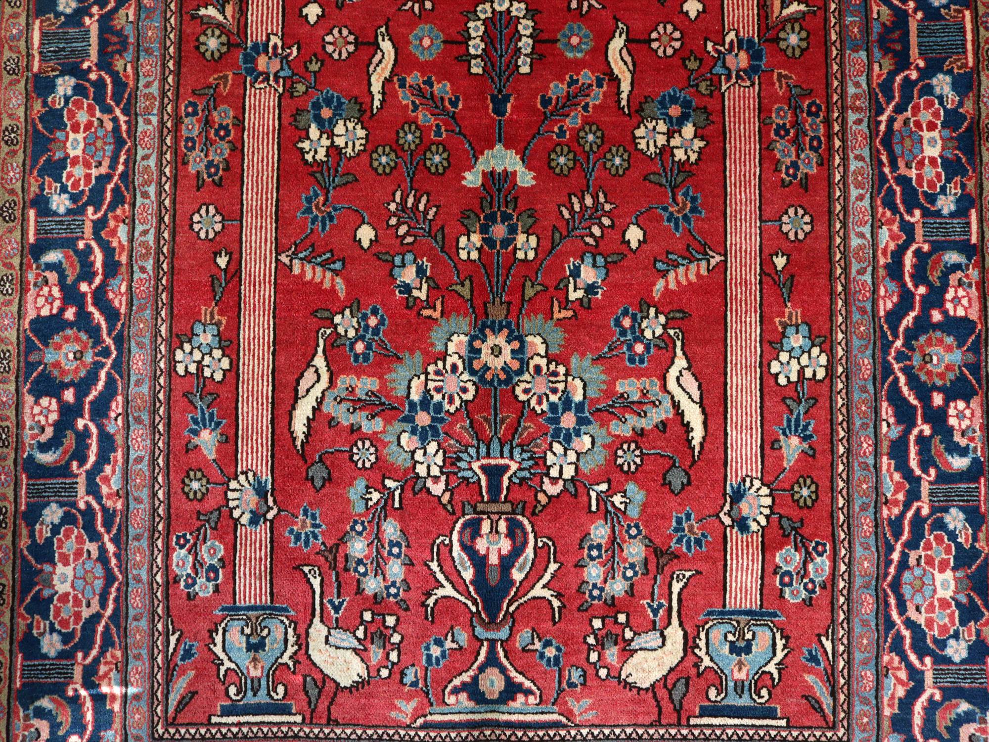 美しい曲線で描いたデザインが特長的なカシャーンの絨毯。細かな織りで、鳥や花、それにミフラープが優雅で上品に表現されています。抑えた朱赤と、額縁のネイビーの丁度よいトーンバランスがデザインの美しさを引き立てます。