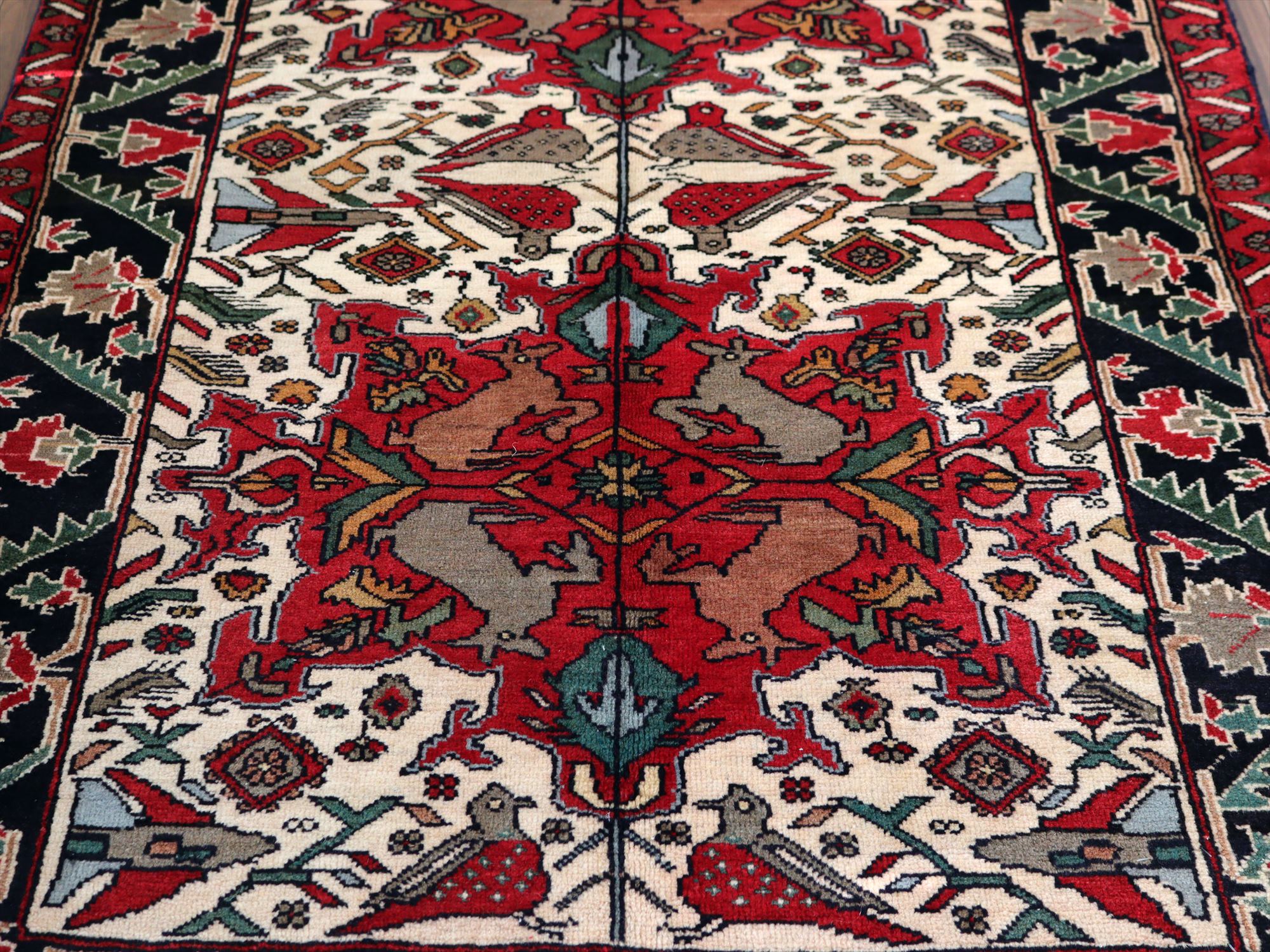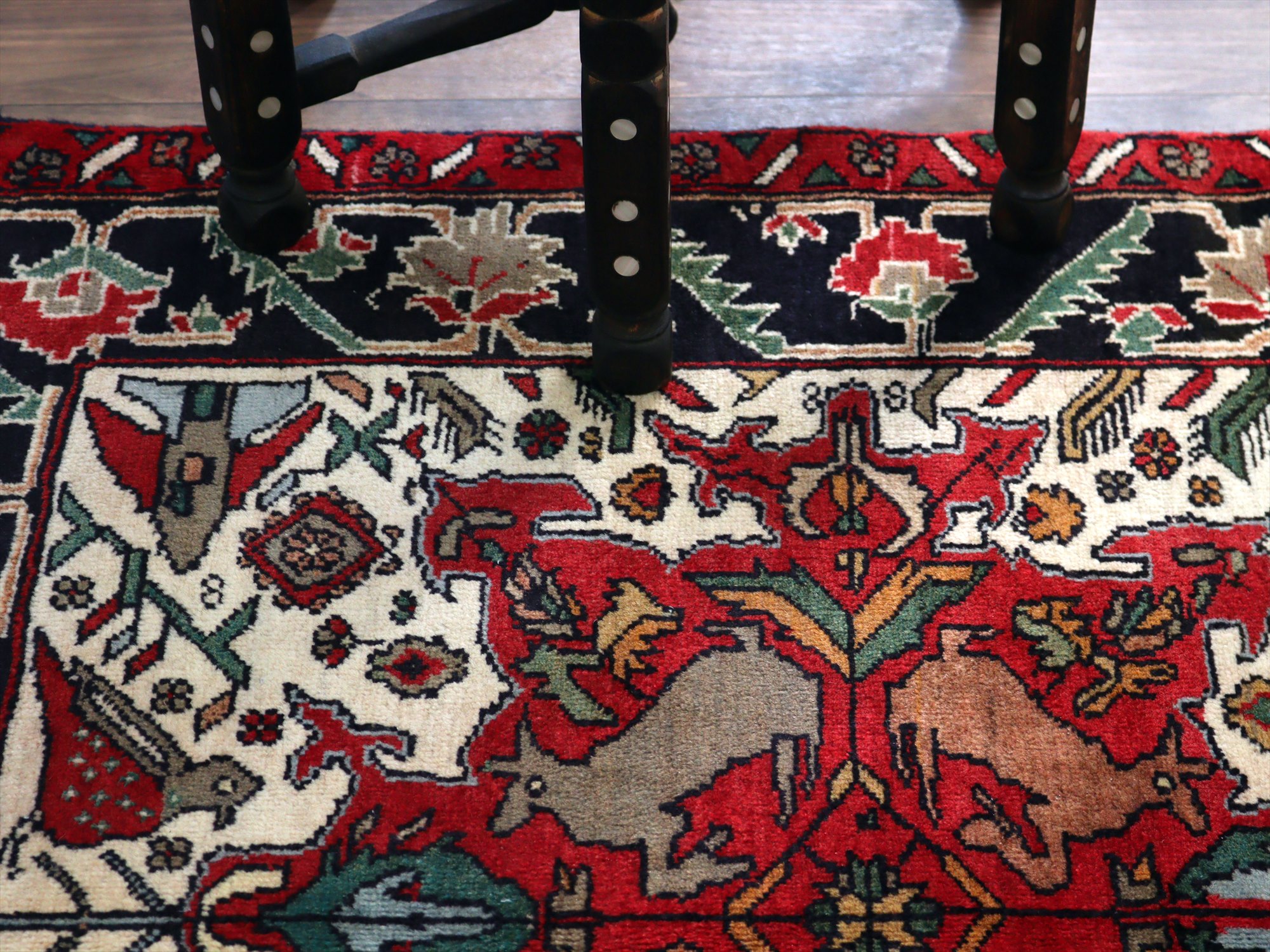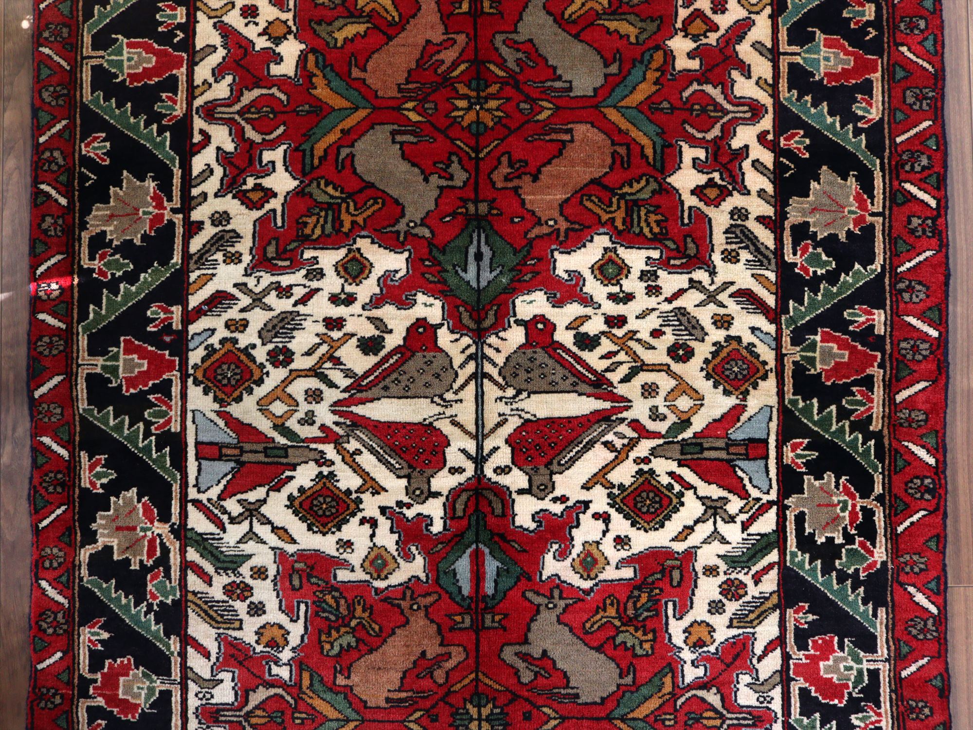 センターはアイボリーベースに動物が織られた花形のメダリオン、額縁部分にはネイビーに花が連なるように織られたデザイン。鳥もデザインに馴染むように織られているようです。