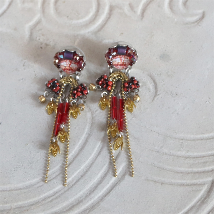 深みあるバーガンディ、プラムのようなカラーが印象的な大人の気品が漂う魅力のNoble Wineという名のシリーズ。メタリックの深紅のビーズとゴールドチェーンが耳元で揺れるピアスです。