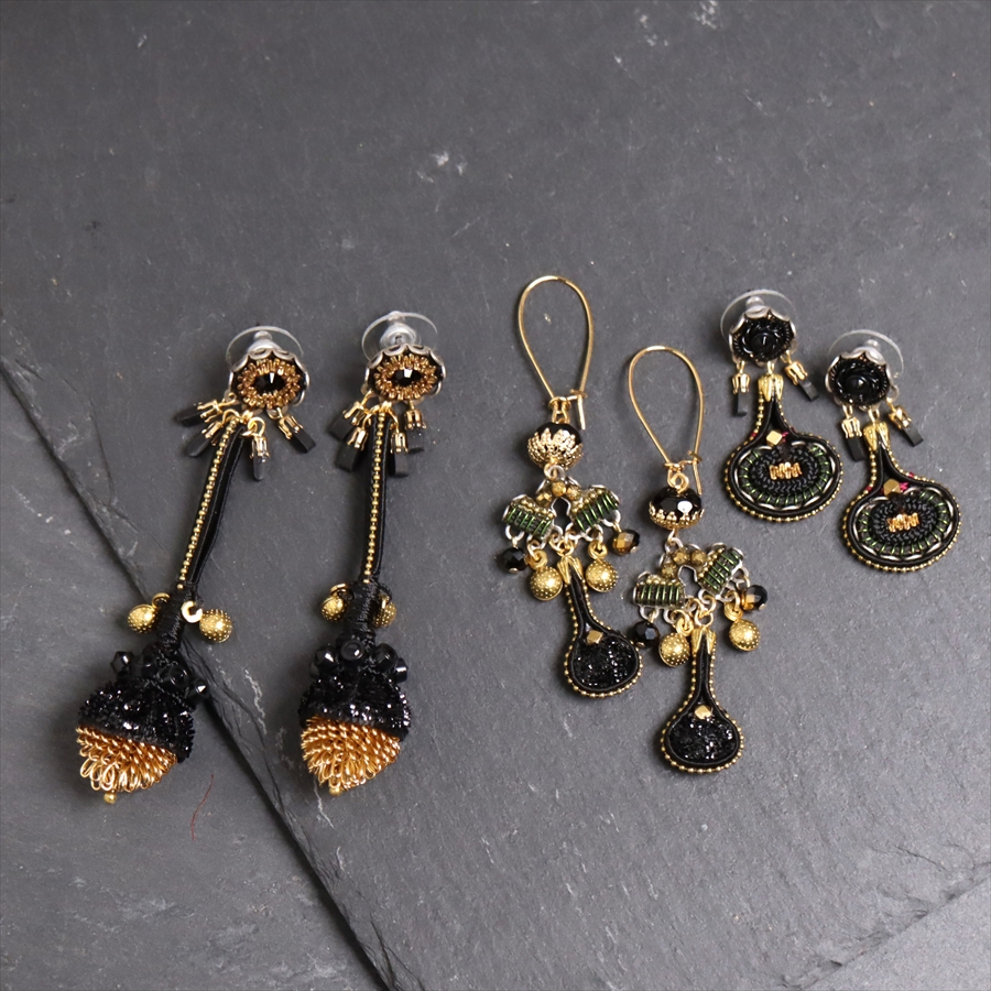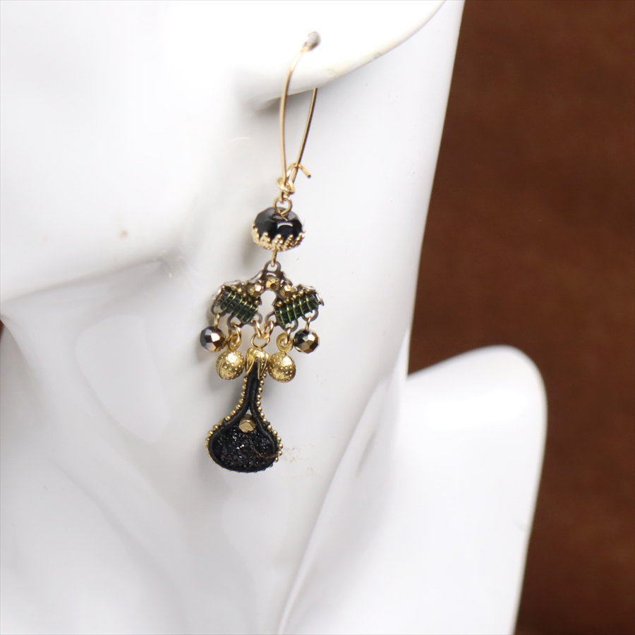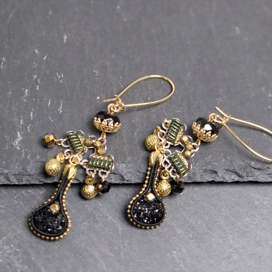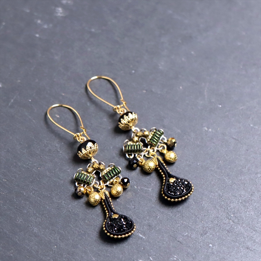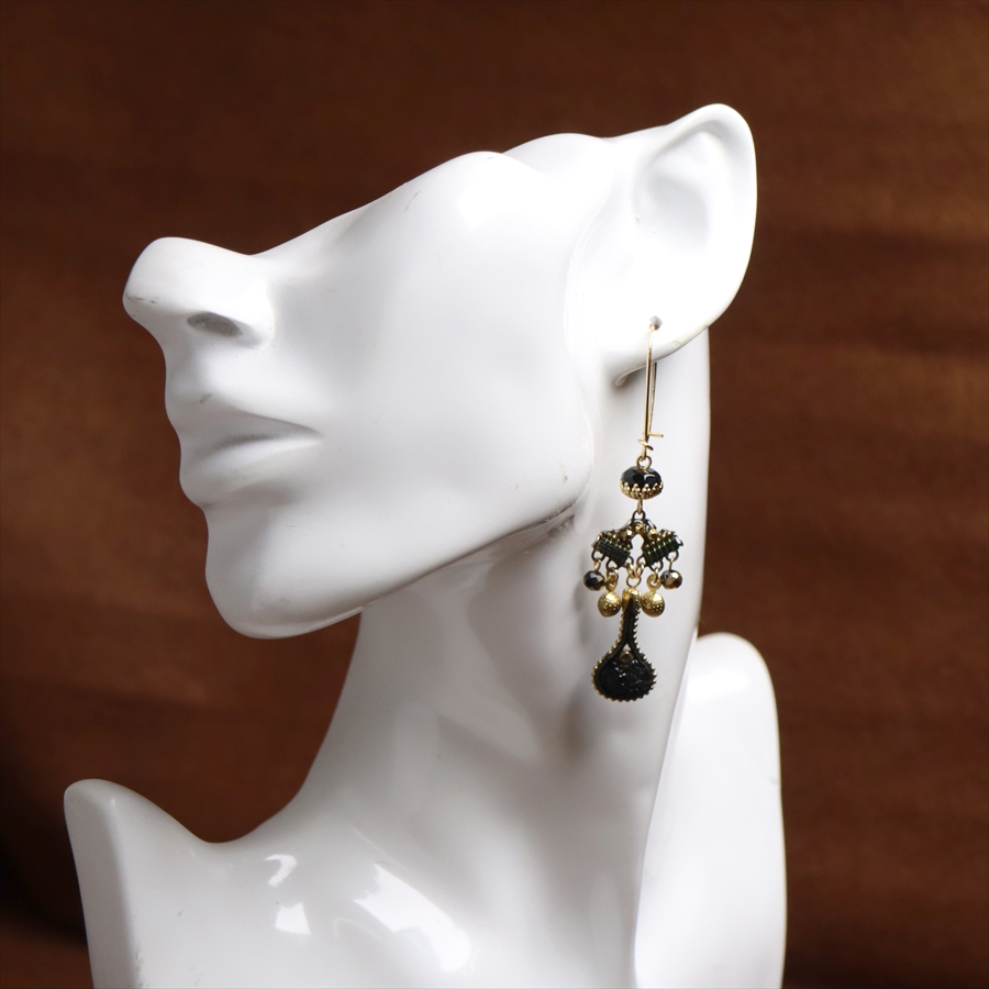 きらめくブラックビーズと艶をおさえたゴールドの融合が印象的な、Gilded Blackという名のシリーズ。フープタイプのフックに細やかなパーツが施された上品なデザインです。
