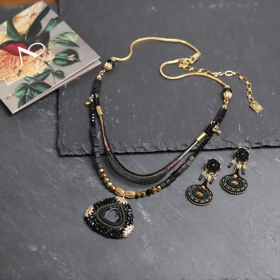きらめくブラックビーズと艶をおさえたゴールドの融合が印象的な、Gilded Blackという名のシリーズ。細やかなパーツが施された上品なデザインです。