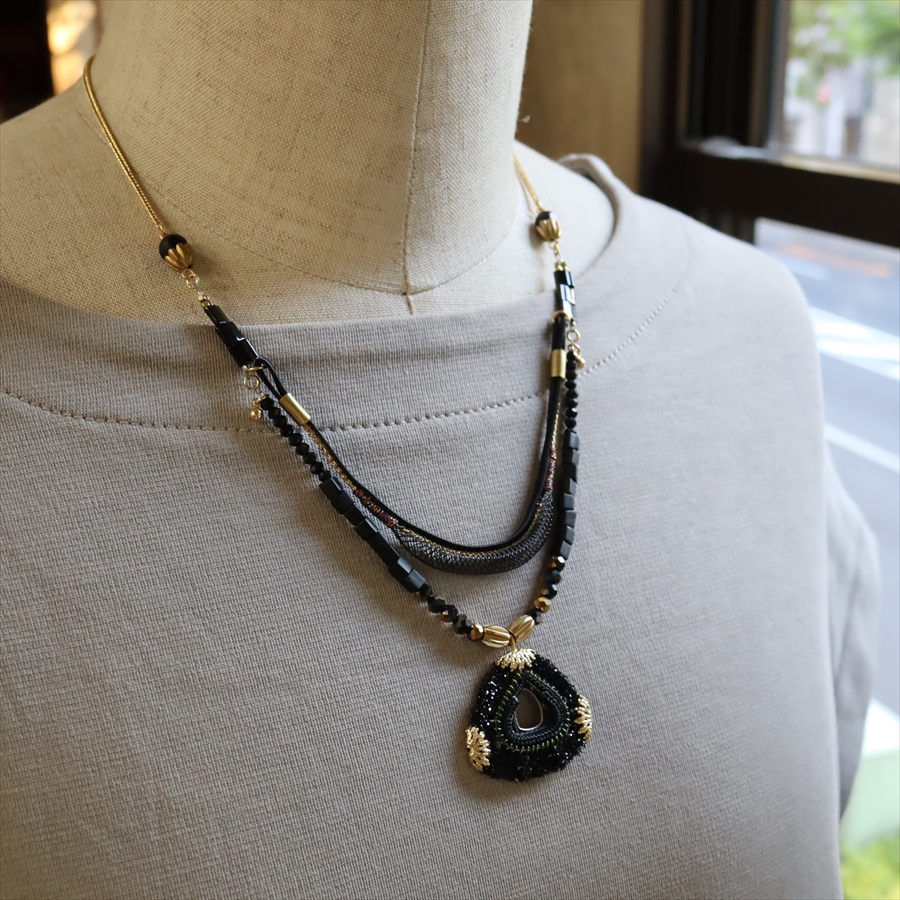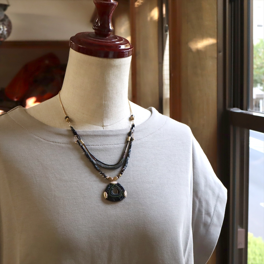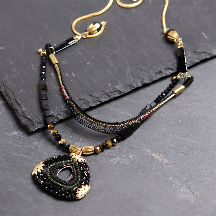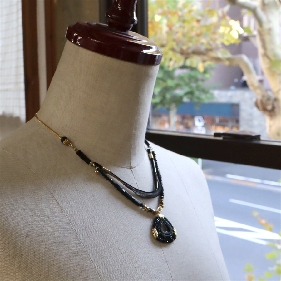 きらめくブラックビーズと艶をおさえたゴールドの融合が印象的な、Gilded Blackという名のシリーズ。繊細でユニークなパーツで表現されたさりげなく華やかなデザインのネックレスです。
