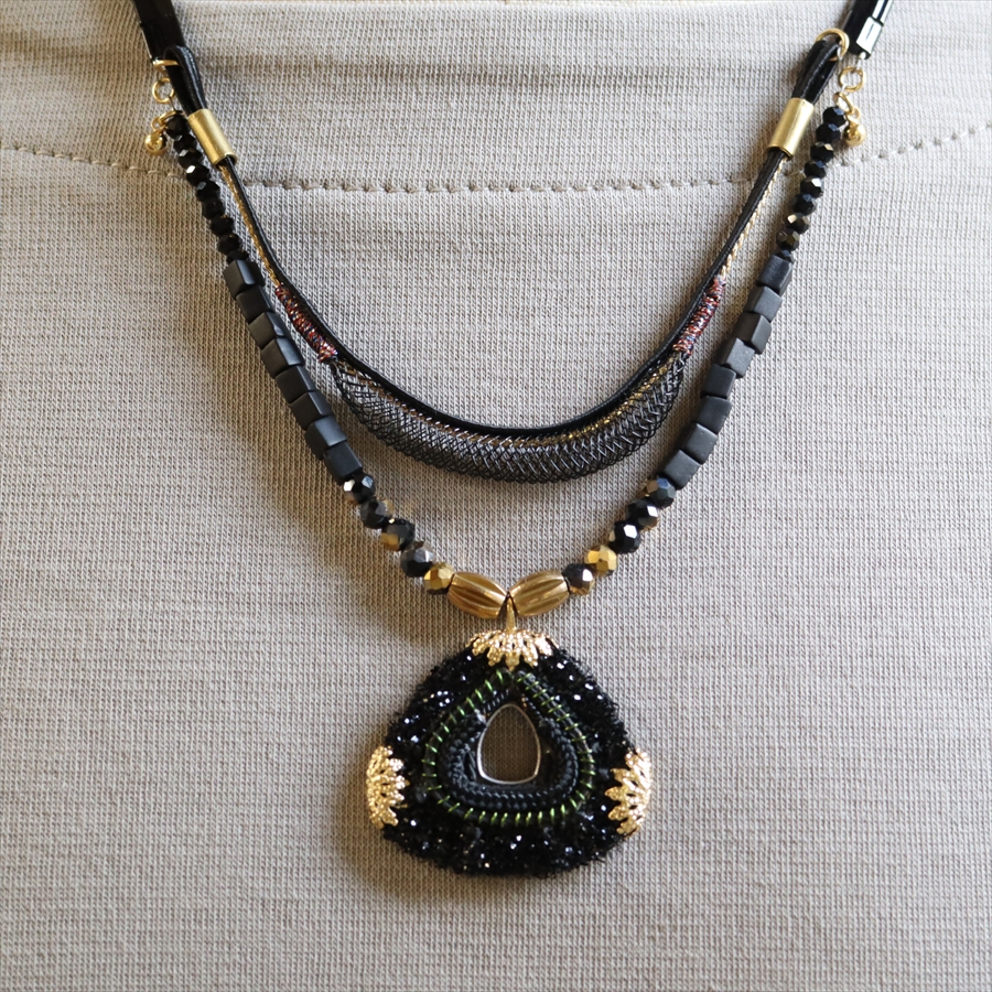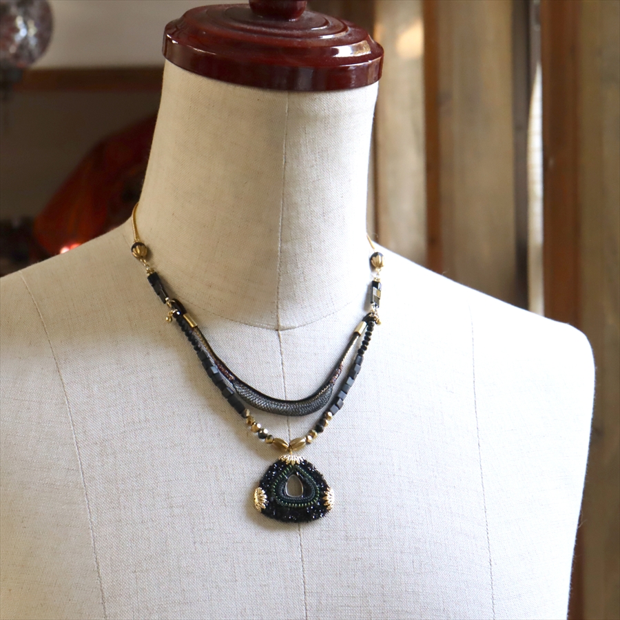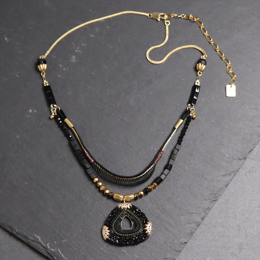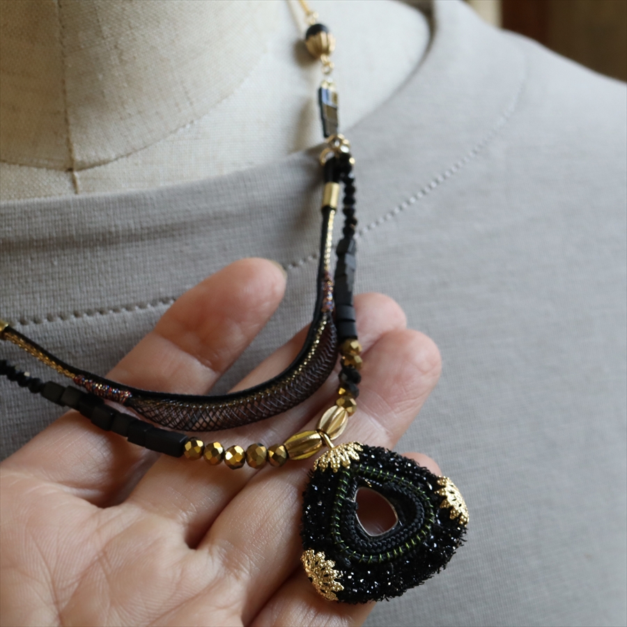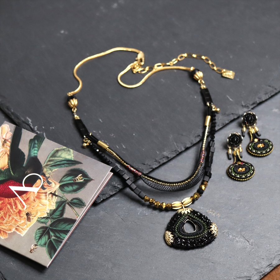 きらめくブラックビーズと艶をおさえたゴールドの融合が印象的な、Gilded Blackという名のシリーズ。繊細でユニークなパーツで表現されたさりげなく華やかなデザインのネックレスです。