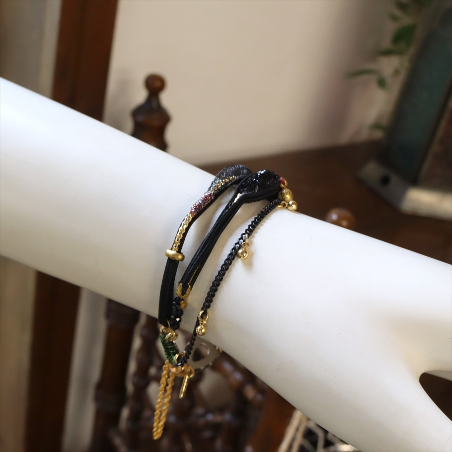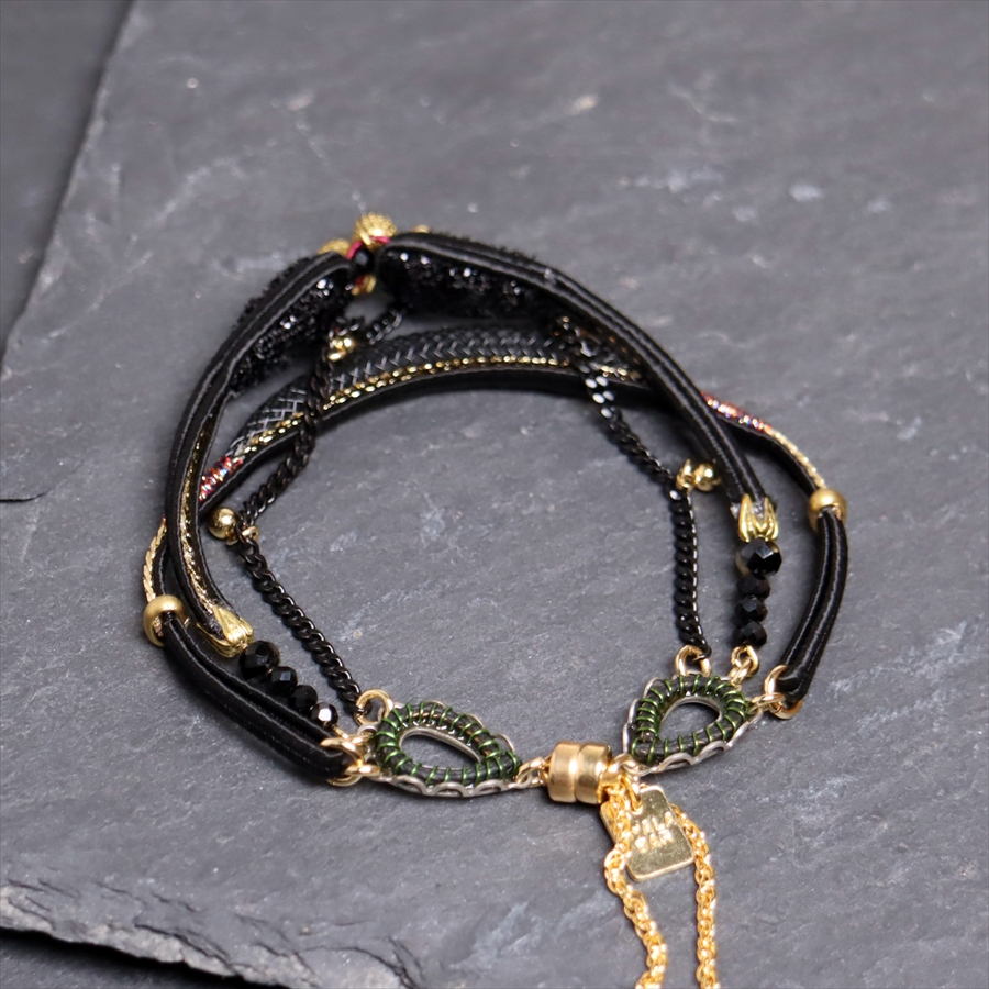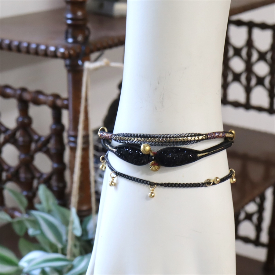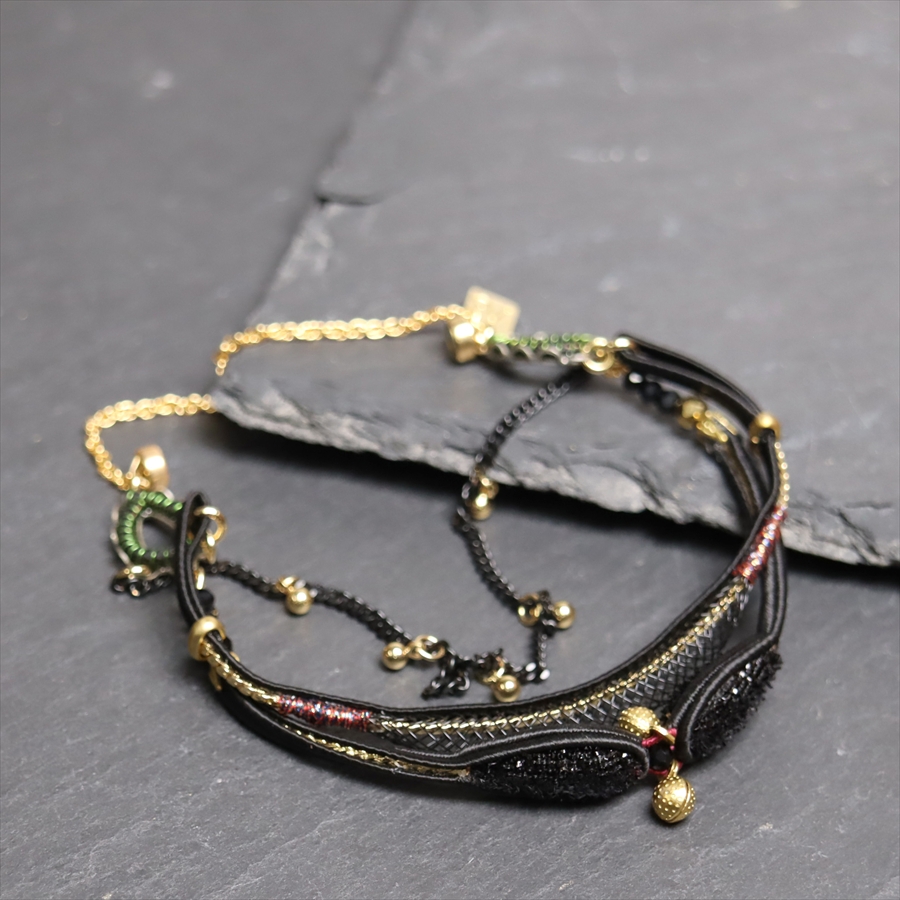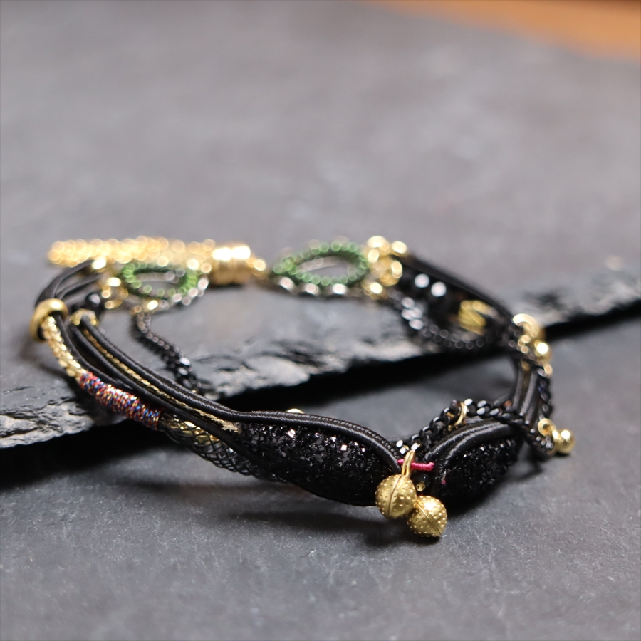 きらめくブラックビーズと艶をおさえたゴールドの融合が印象的な、Gilded Blackという名のシリーズ。繊細でユニークなパーツで表現されたさりげなく華やかなデザインのブレスレットです。