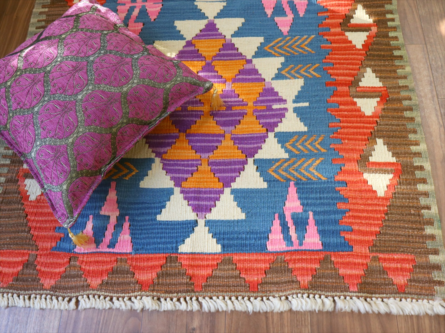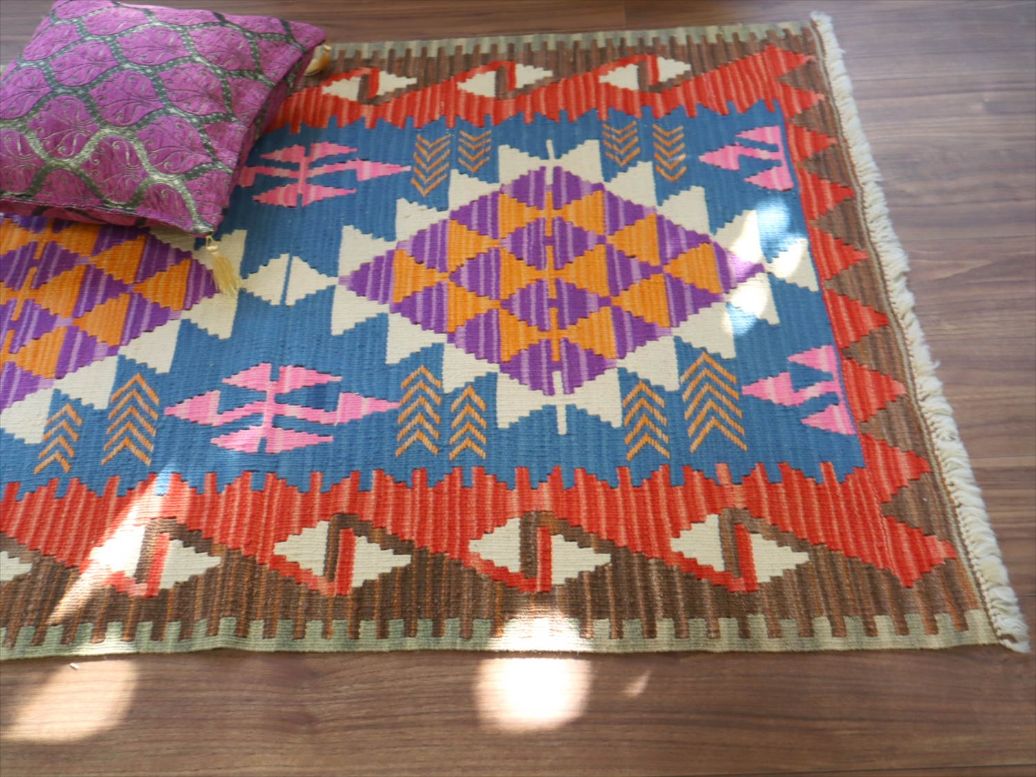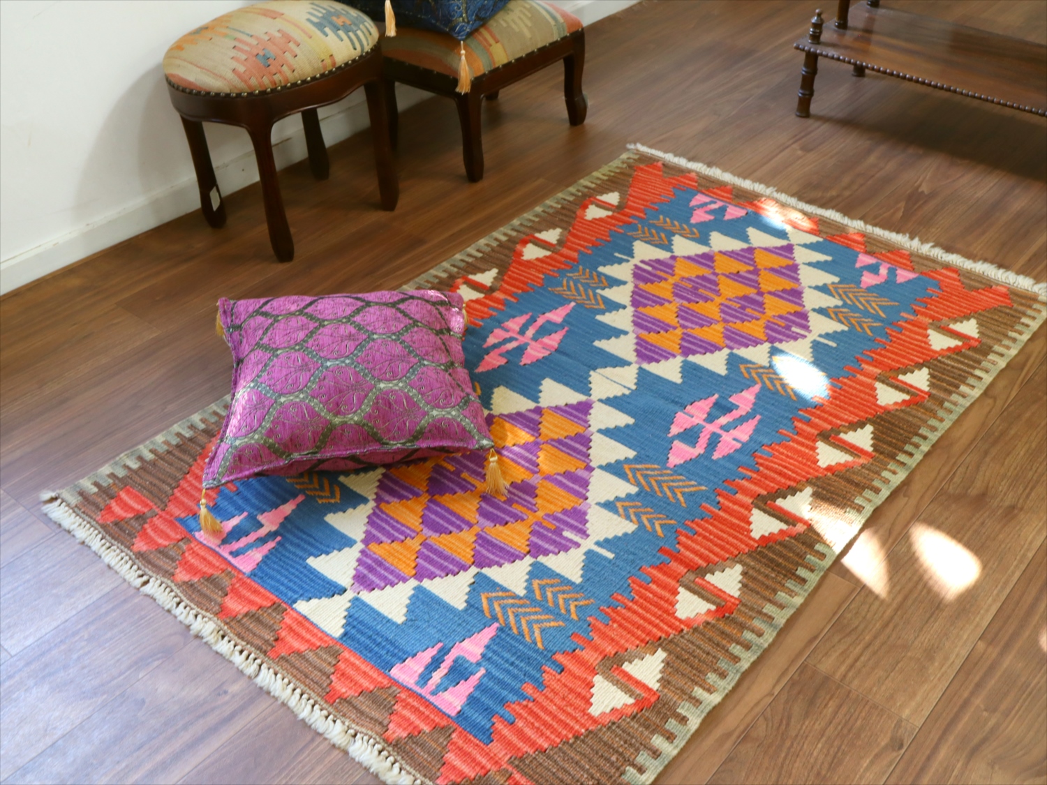 21世紀に入ってからも伝統的なキリム織りの技法を受け継ぎ、織り継がれているカイセリ地方のキリムです。明るい色使いと、大胆な幾何学柄のデザインで、トルコキリムといえばこんな感じ!とイメージされる方も多いのでは?