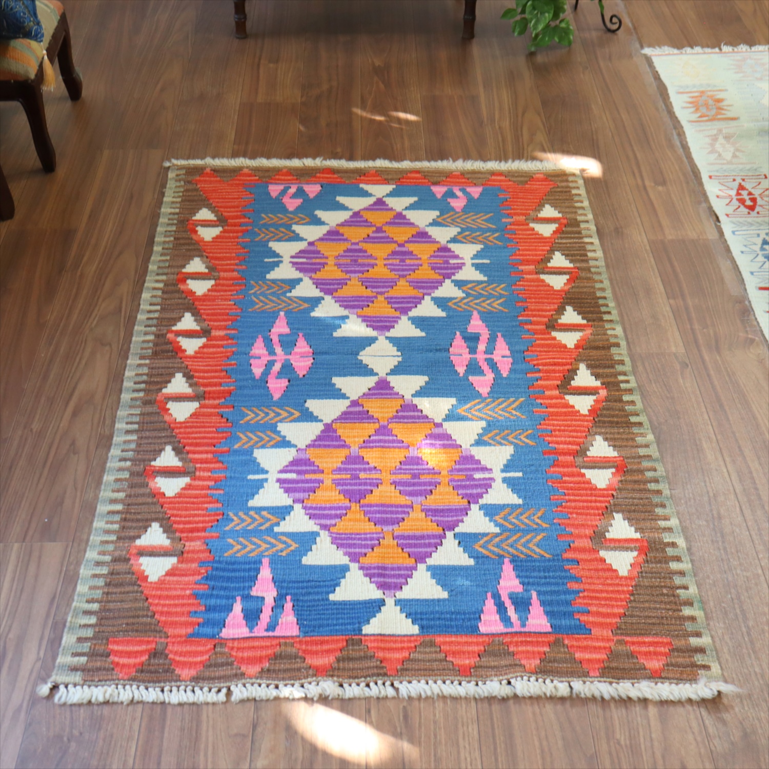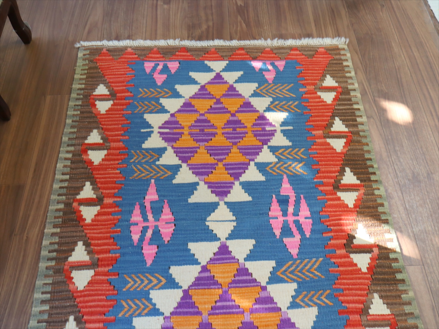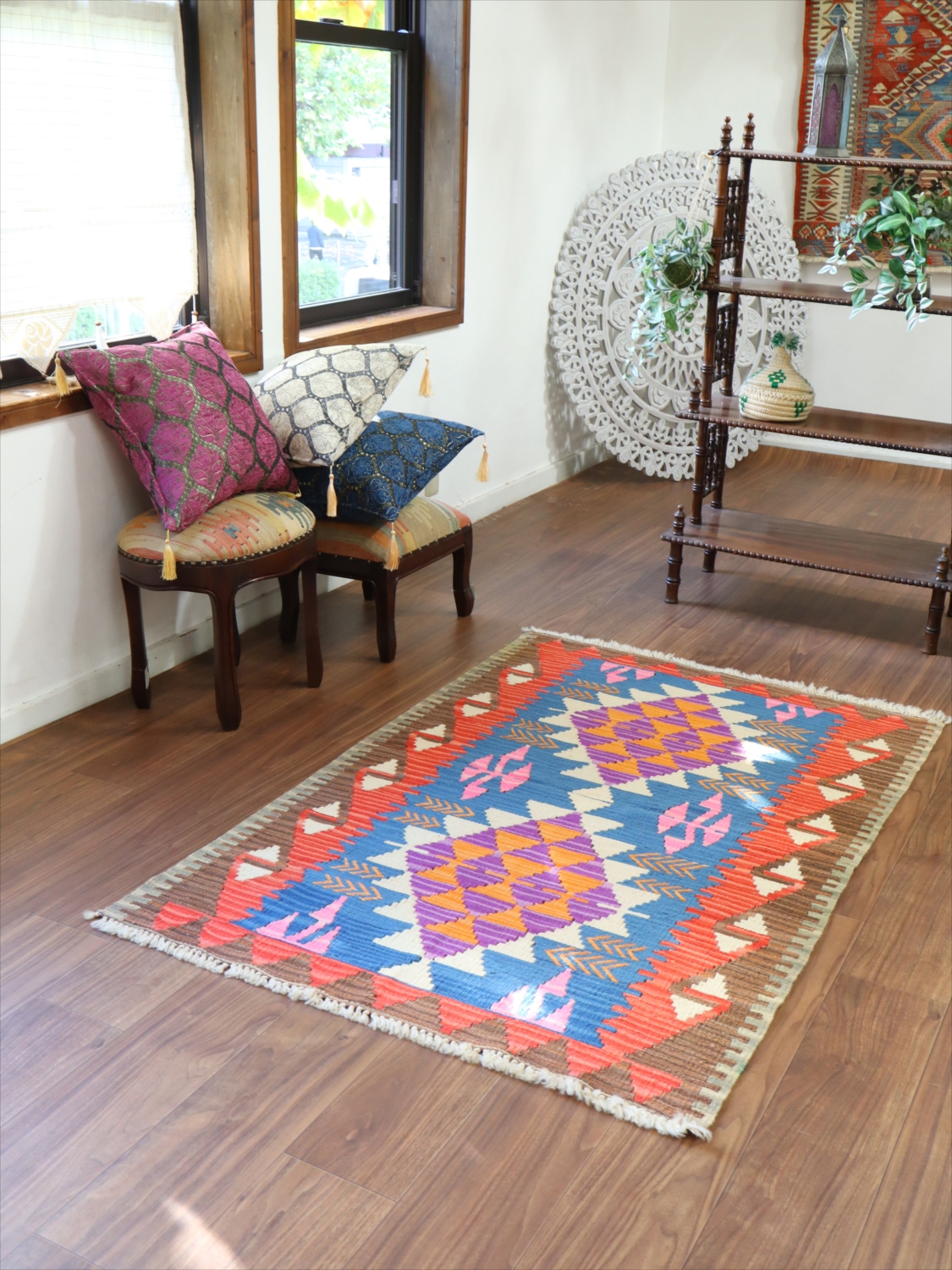 21世紀に入ってからも伝統的なキリム織りの技法を受け継ぎ、織り継がれているカイセリ地方のキリムです。明るい色使いと、大胆な幾何学柄のデザインで、トルコキリムといえばこんな感じ!とイメージされる方も多いのでは?