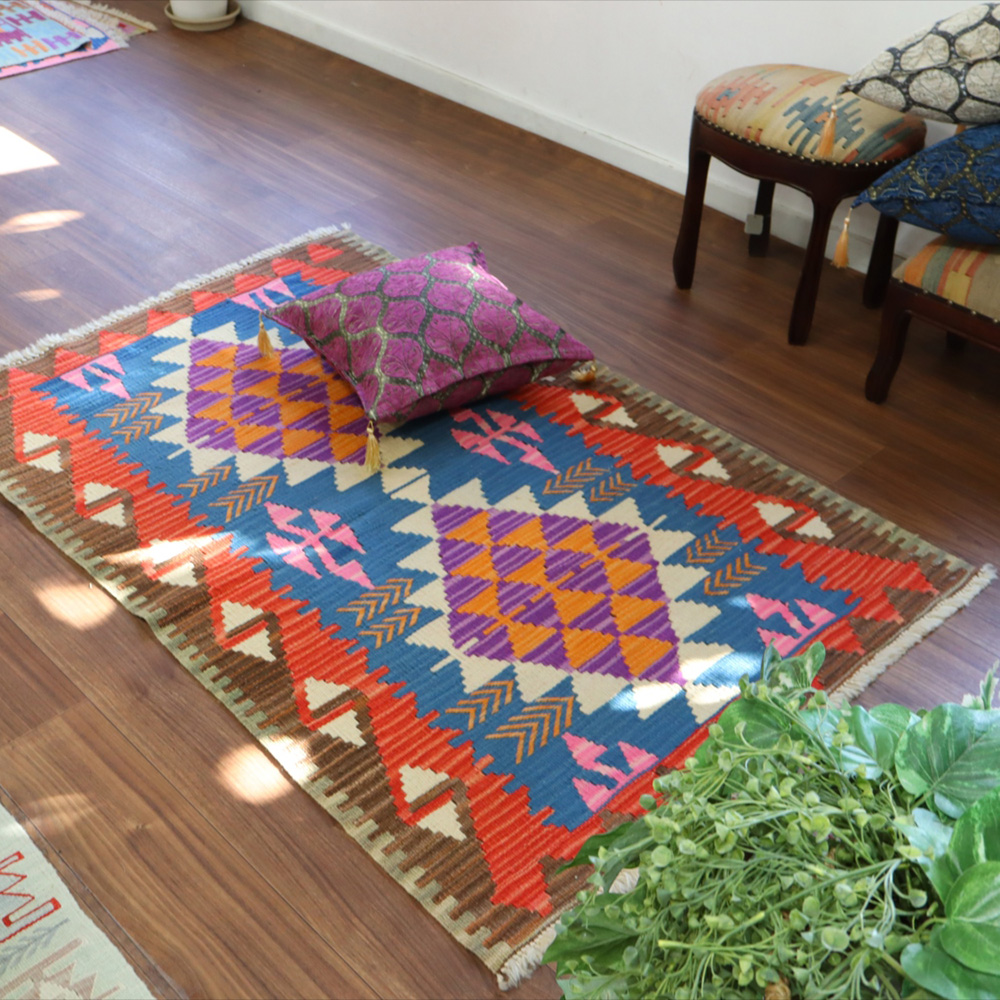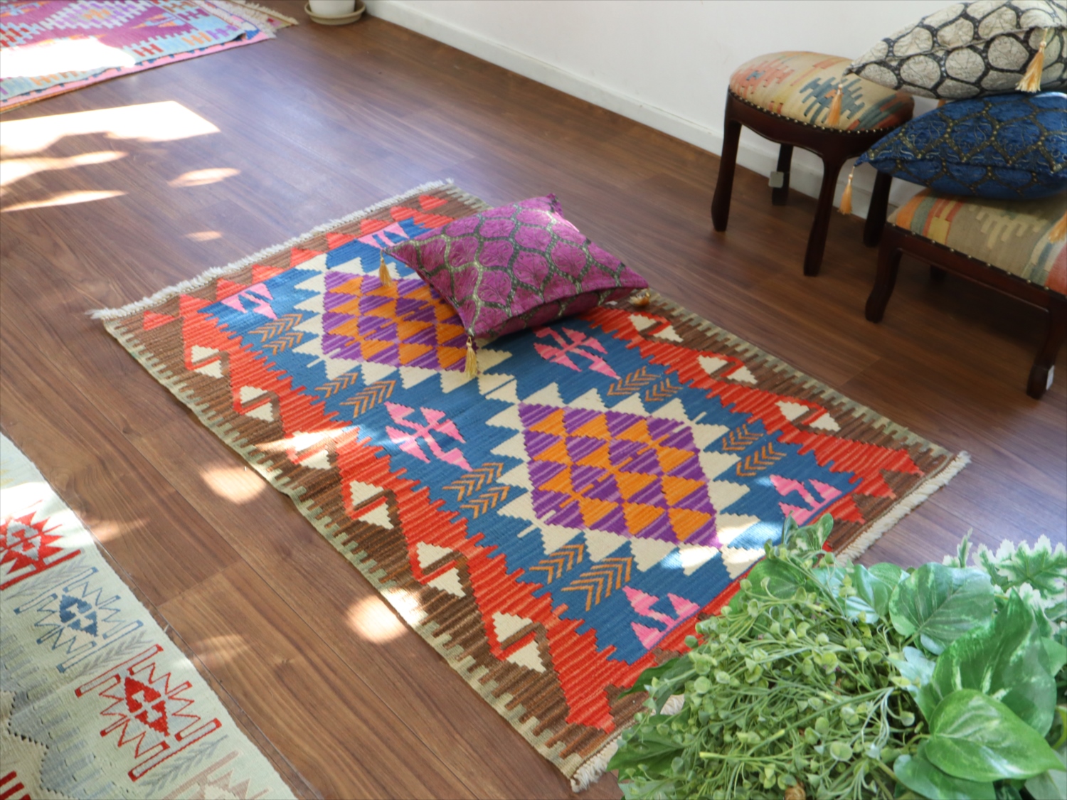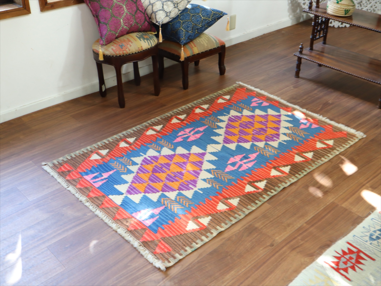 似ているデザインのキリムがあっても、細かなところは色やサイズ、形などがそれぞれ異なっていて、どれも世界で一枚だけの手織りキリムです。