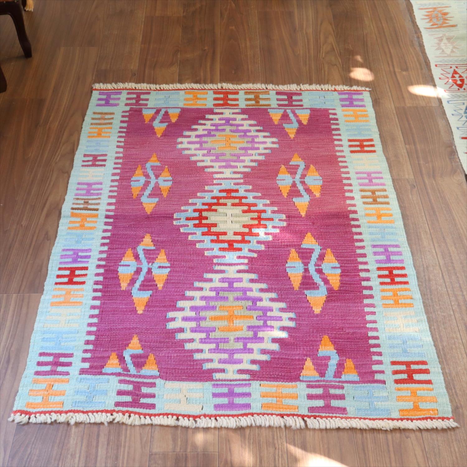 トルコキリム 手織りラグ133×100cm カイセリ産 明るい色の幾何学モチーフ