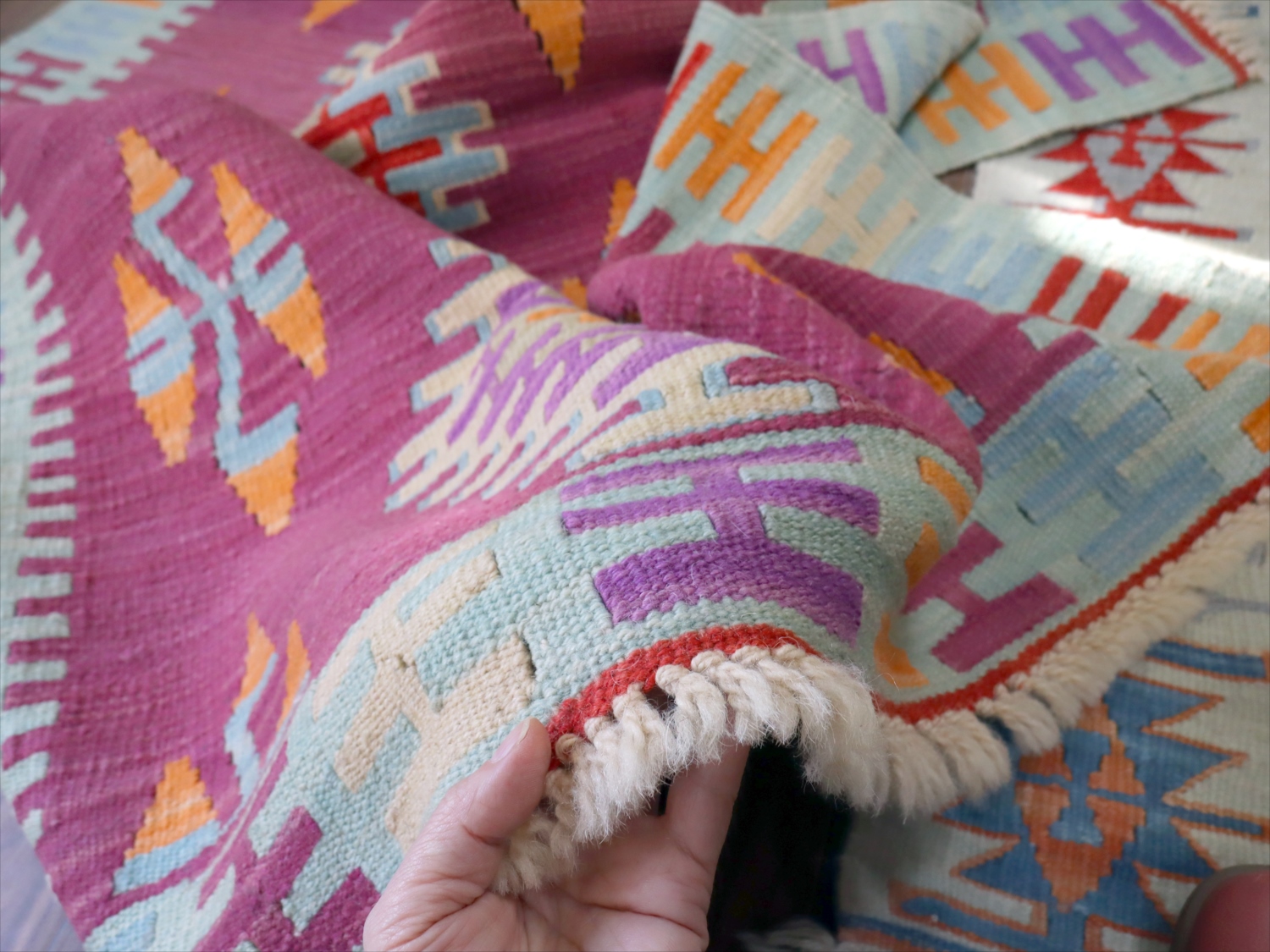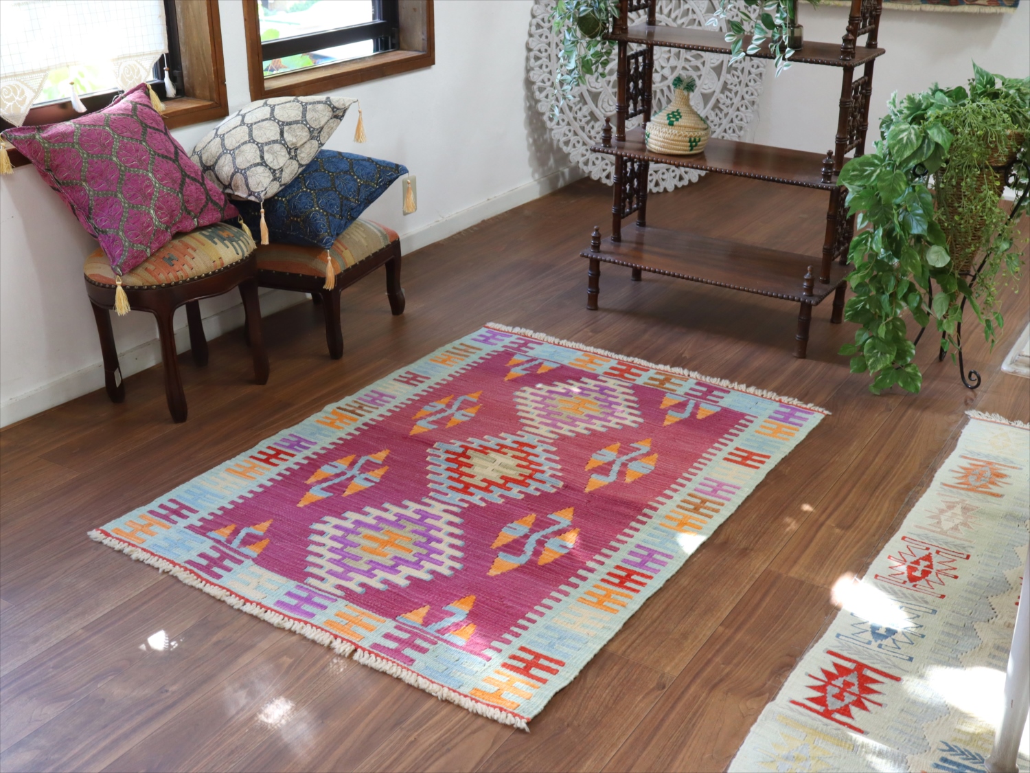 似ているデザインのキリムがあっても、細かなところは色やサイズ、形などがそれぞれ異なっていて、どれも世界で一枚だけの手織りキリムです。