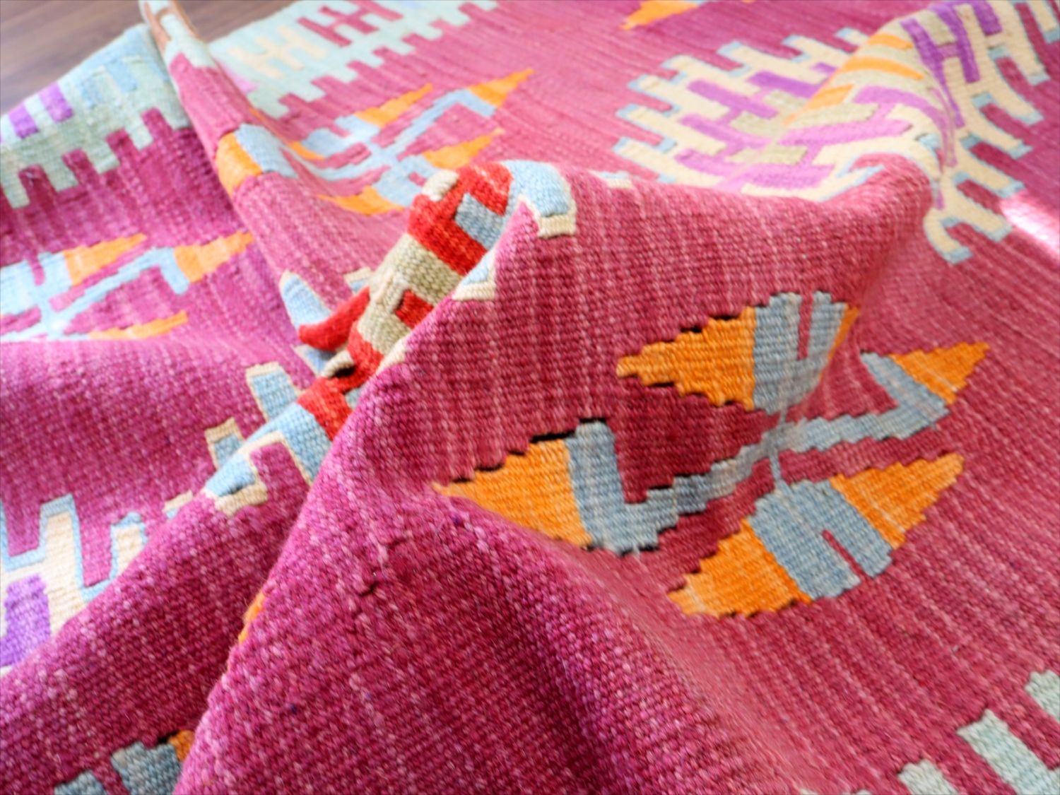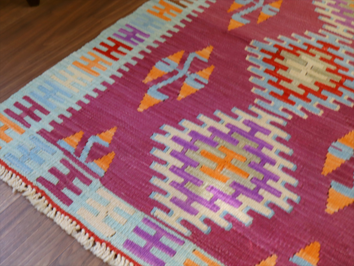21世紀に入ってからも伝統的なキリム織りの技法を受け継ぎ、織り継がれているカイセリ地方のキリムです。明るい色使いと、大胆な幾何学柄のデザインで、トルコキリムといえばこんな感じ!とイメージされる方も多いのでは?