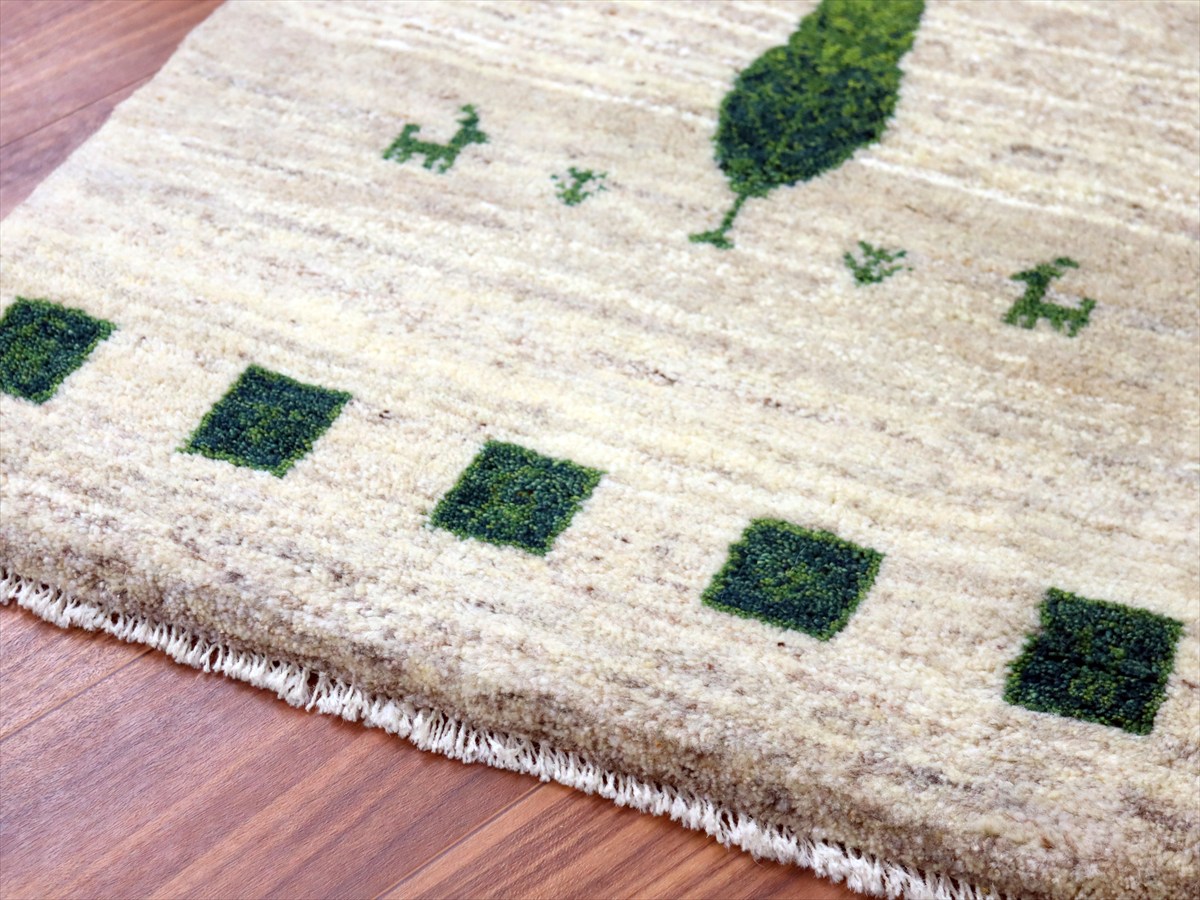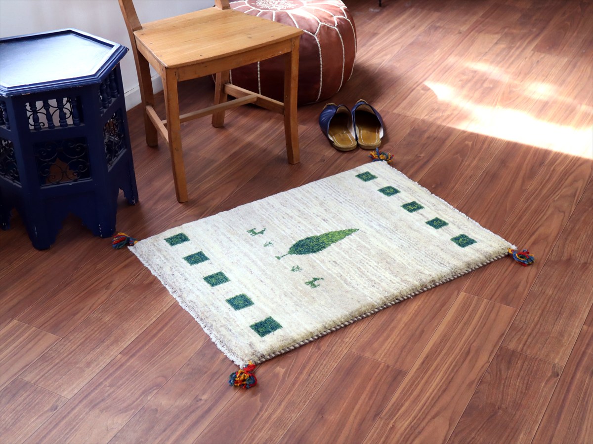 - 【15%OFF】ギャッベ イラン産手織り 85×60cm 玄関マット ナチュラルアイボリー 糸杉と動物モチーフ