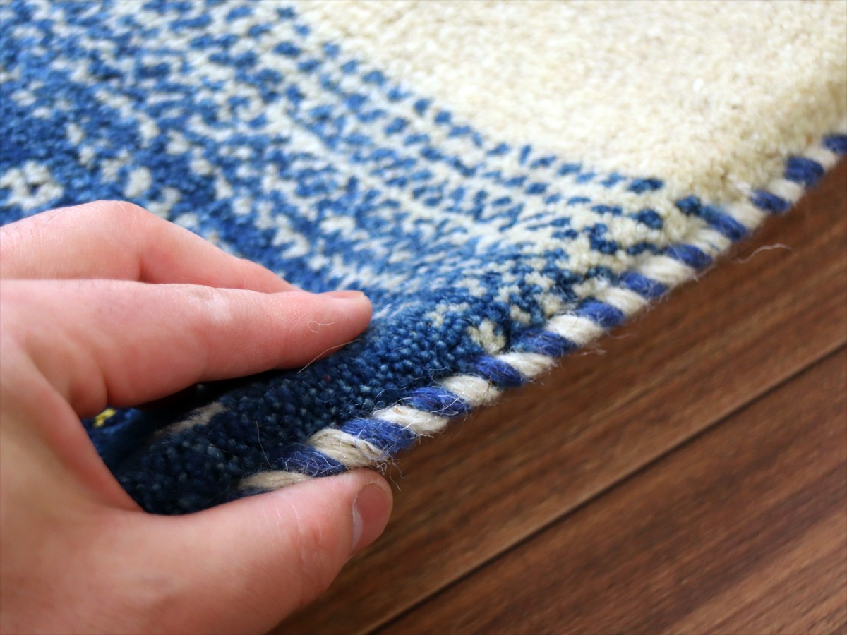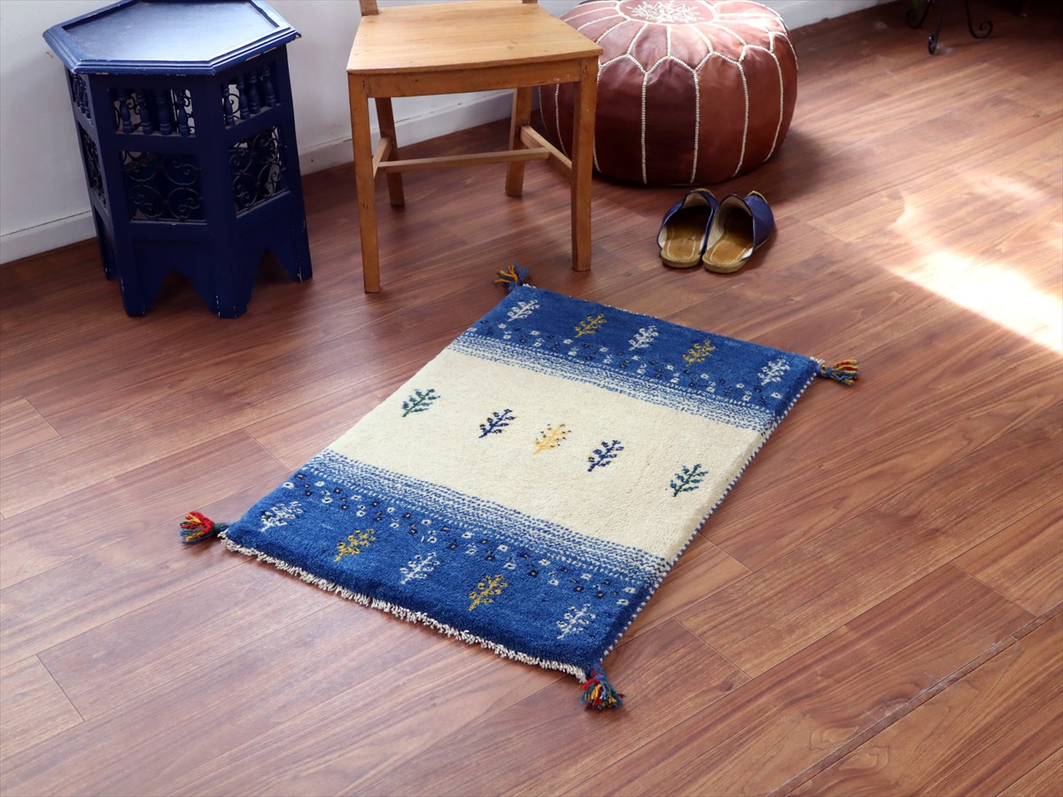 - 【15%OFF】ギャッベ イラン産手織り 87×59cm 玄関マット ナチュラルアイボリー&ブルー 生命の樹