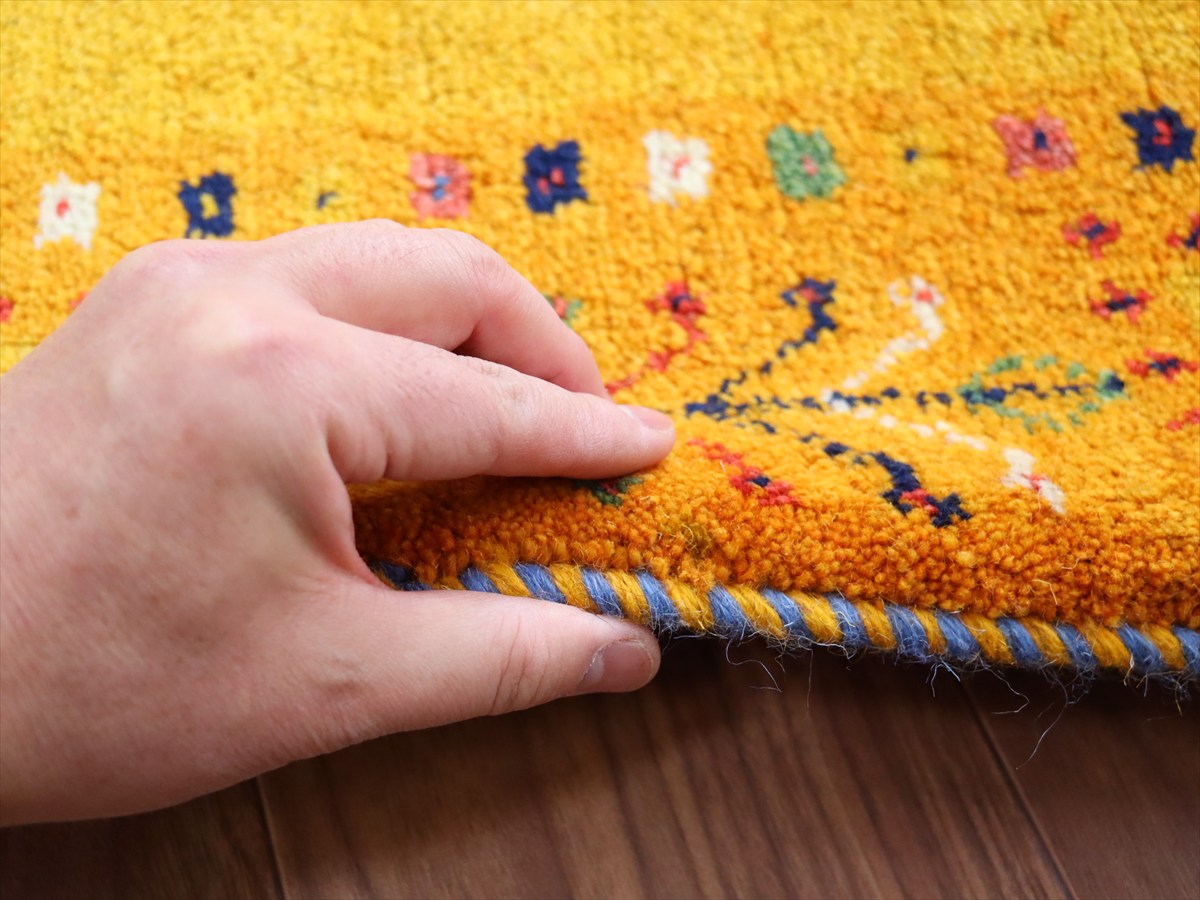 Key:Gabbeh, Tribal rug, Shiraz, Fars, Iran, Persia, Wool, ギャッベ, ふかふか, ギャベ, ラグ, 絨毯, イラン, イエロー, オレンジ 黄色 玄関マット シラーズ, ペルシャ, バザールギャッベ, ポンポン, 手織り, 草木染, 一点もの, 現品販売, 玄関マット, ガラタバザール
