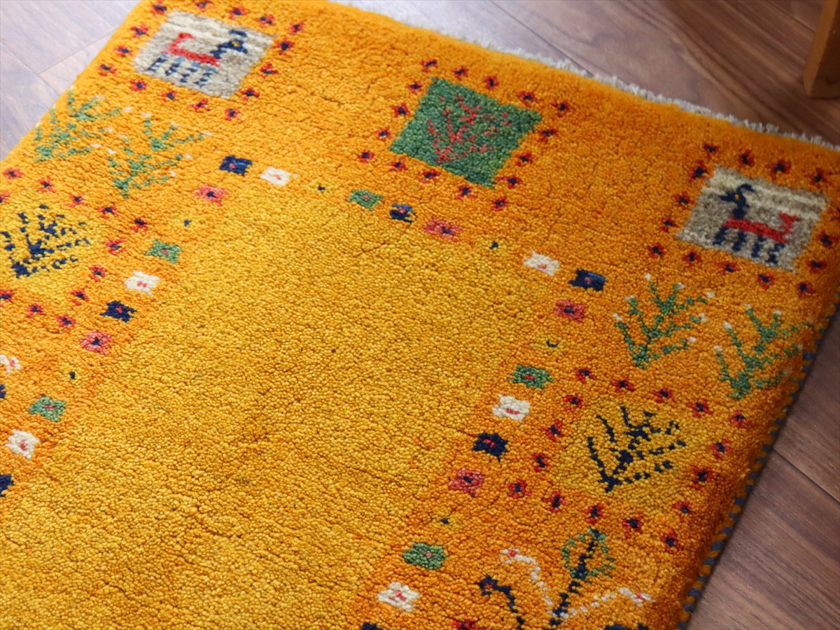 【15%OFF】ギャッベ イラン産手織り 89×59cm 玄関マット オレンジ イエロー 生命の樹と動物