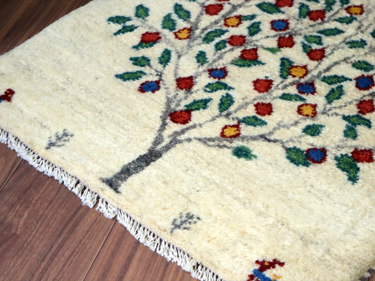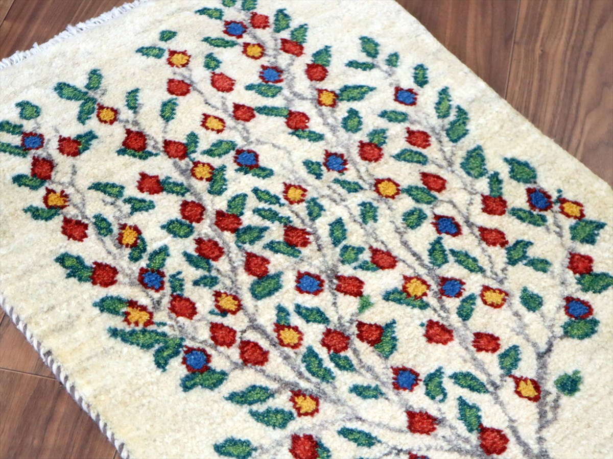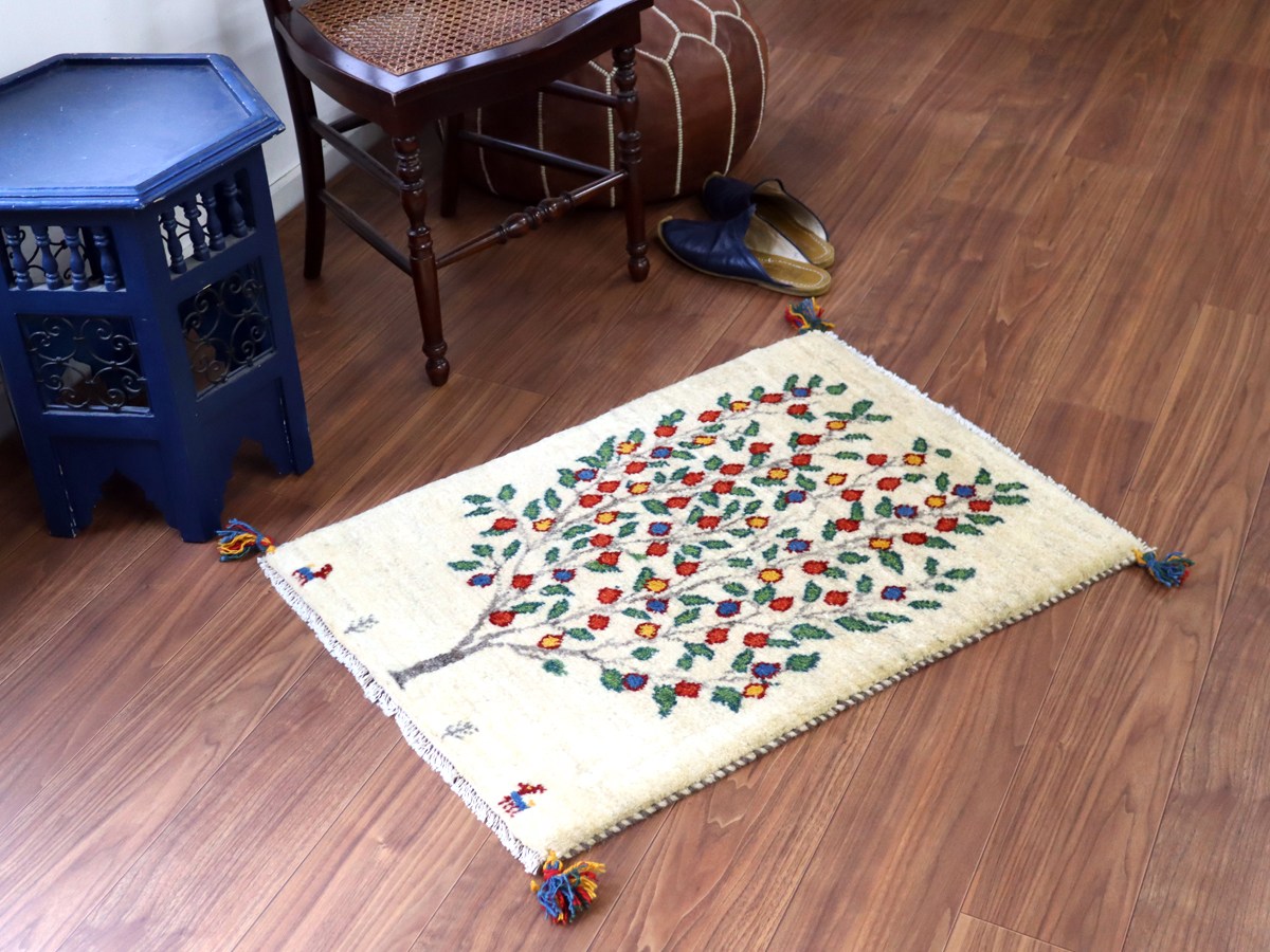 - 【15%OFF】ギャッベ イラン産手織り 88×62cm 玄関マット ナチュラルアイボリー カラフルな生命の樹