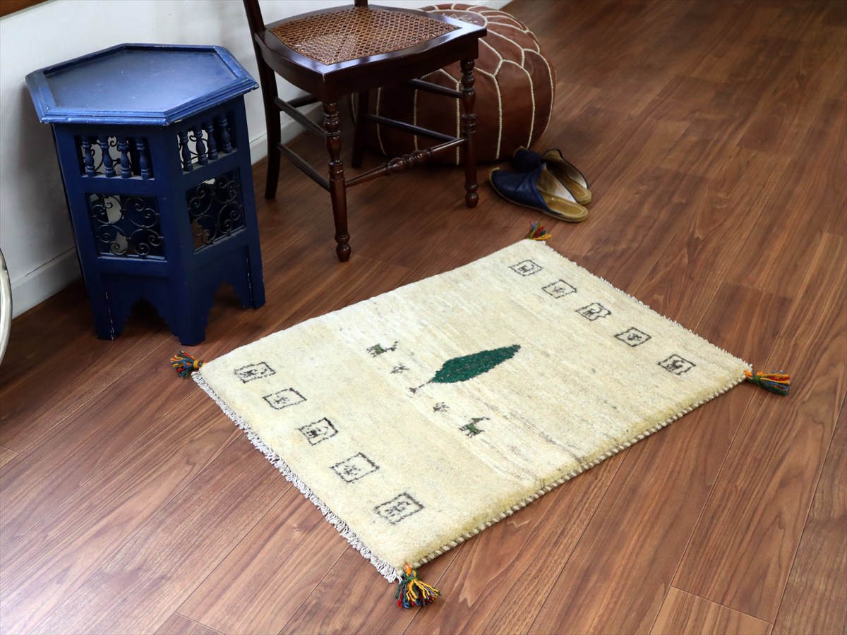 【15%OFF】ギャッベ イラン産手織り 85×65cm 玄関マット ナチュラルアイボリー 糸杉と動物モチーフ