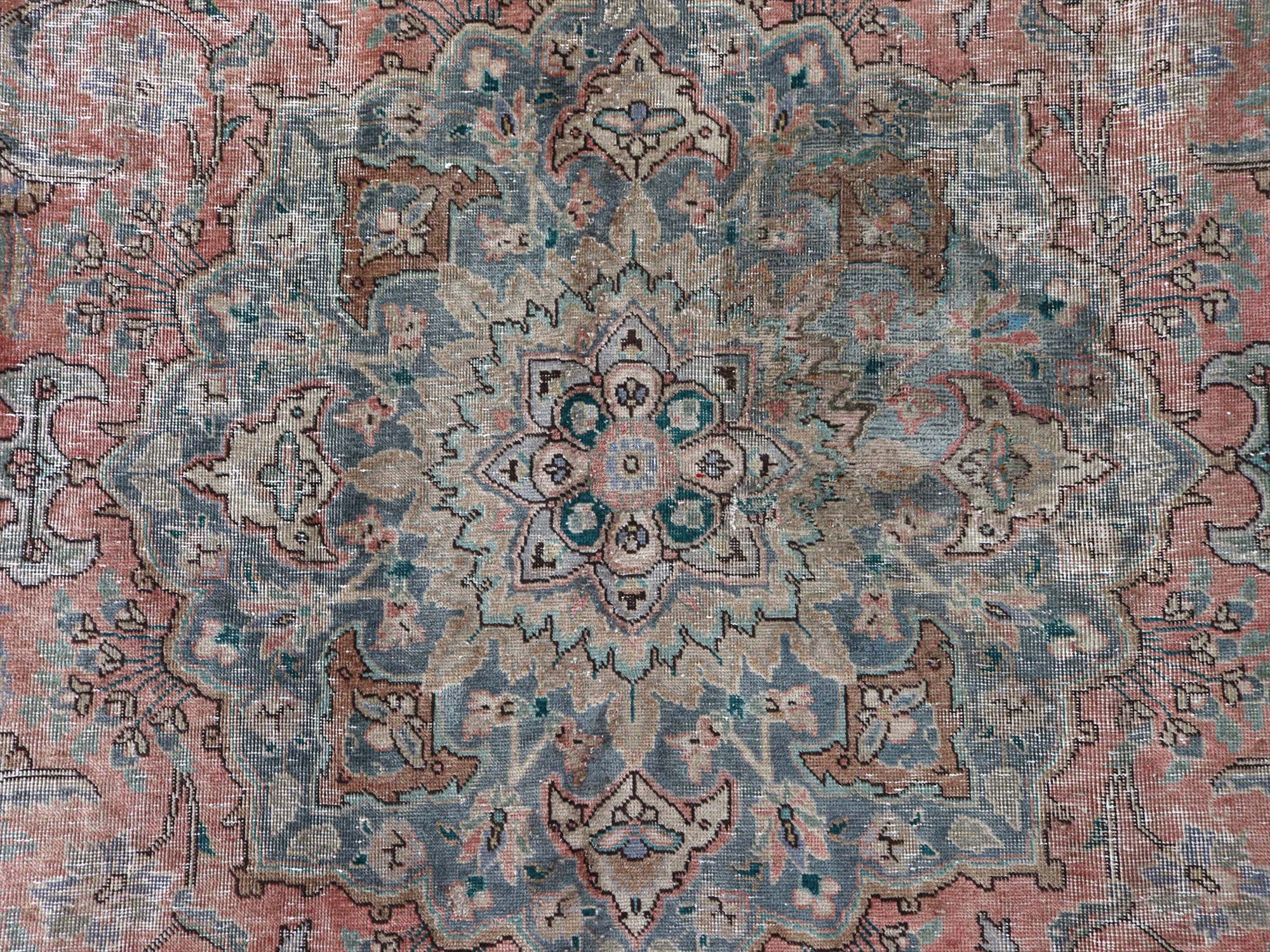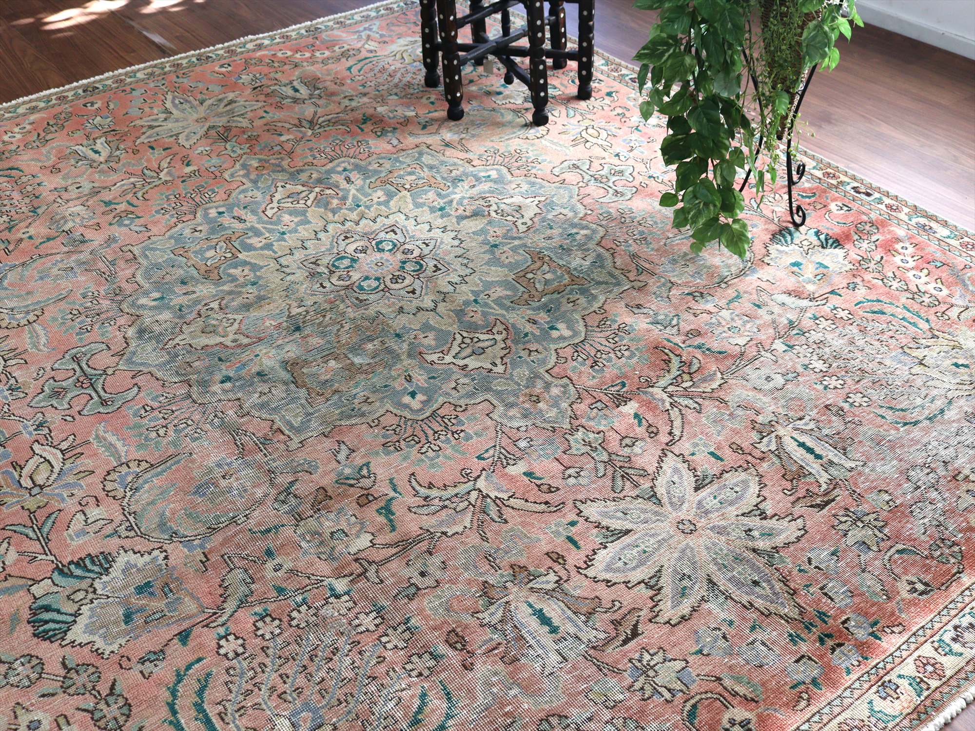 ダメージが多く、使われなくなった古い手織りカーペットを、洗った上でブリーチをかけたユーズドラグです。全体的に色褪せた雰囲気がよく出ていて、しっとりと落ち着いた印象に仕上がっています。オリジナルの絨毯は、イラン北西部、タブリーズ地方のもので、大きなメダリオン柄です。