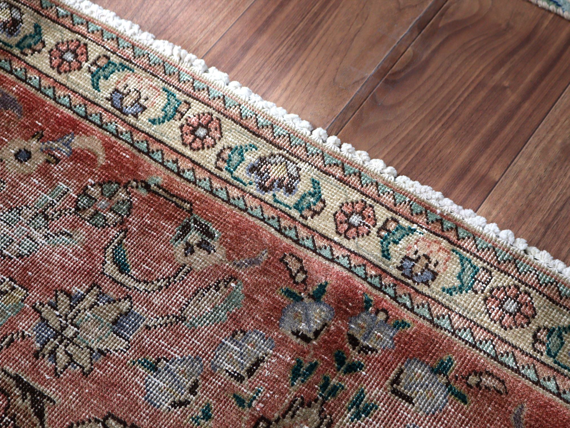 【ヴィンテージウォッシュ】長い間使われて、パイルのすり減りなどダメージのあるラグを、リサイクルするためにクリーニング、ブリーチ加工したアップルサイクルの手織りラグです。ダメージ部分も、年代を経たラグならではの味わいととらえています。ブリーチ(脱色)したあとに、別の色に染めたものをオーバーダイドラグと呼んでいます。