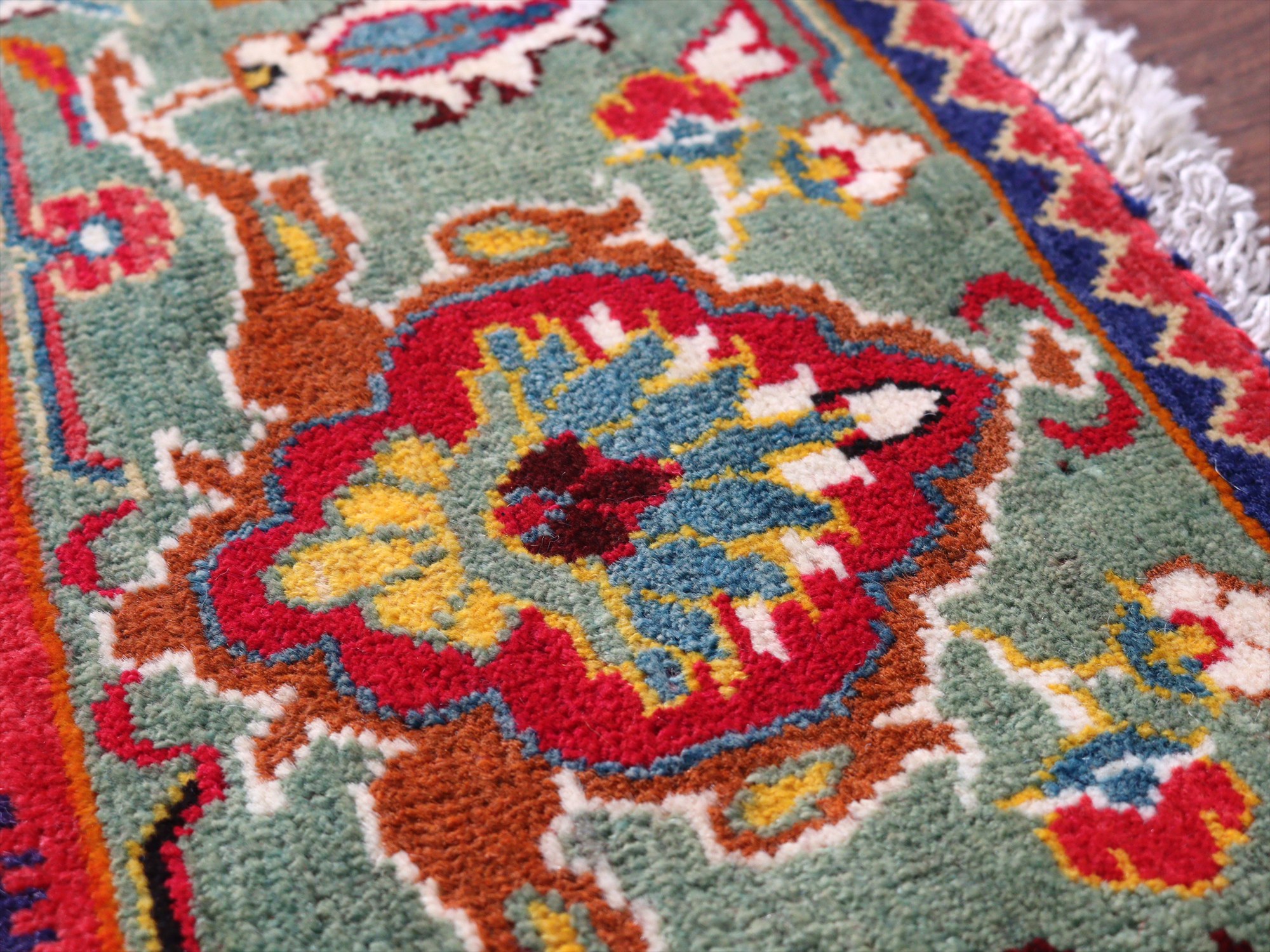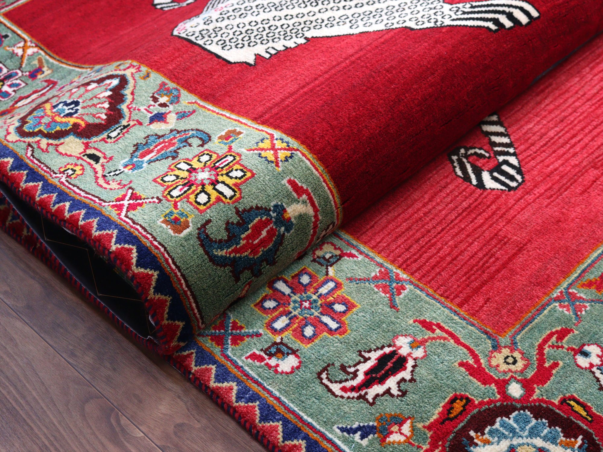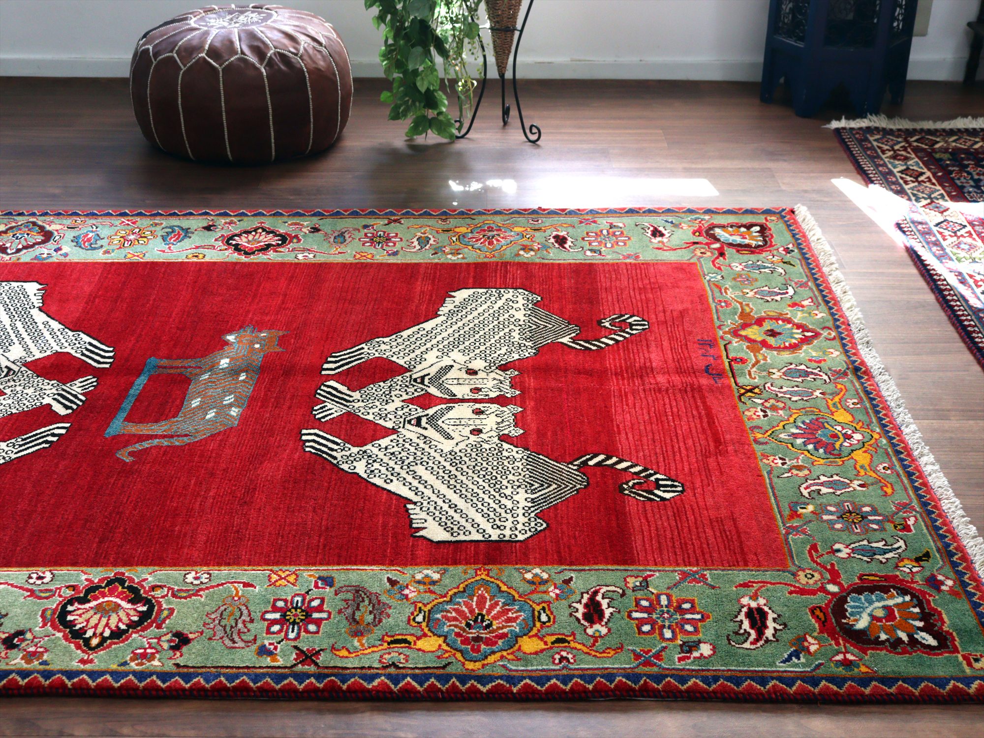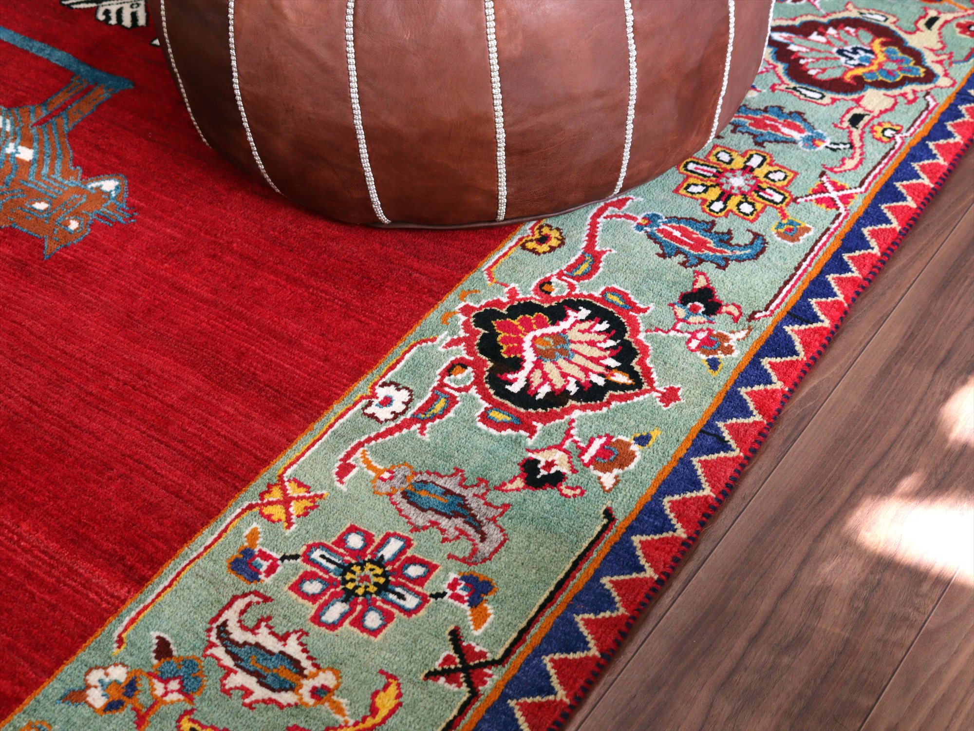 このギャッベは、ライオンに加えて、大胆な色使いの華やかなボーダーデザインも注目のポイントです。サイズの大きさも十分で、リビングを彩るコレクションとしておすすめの一枚です。