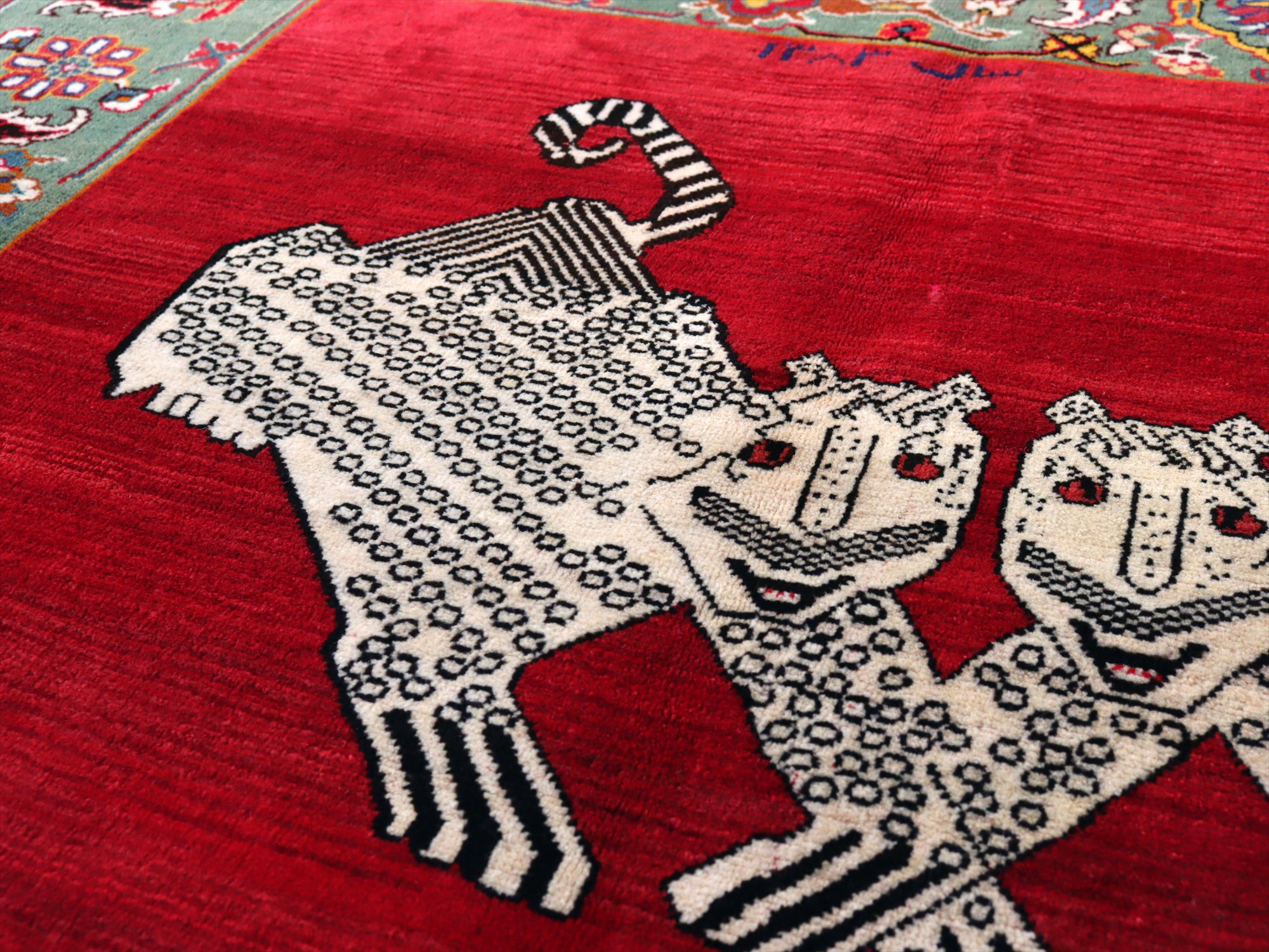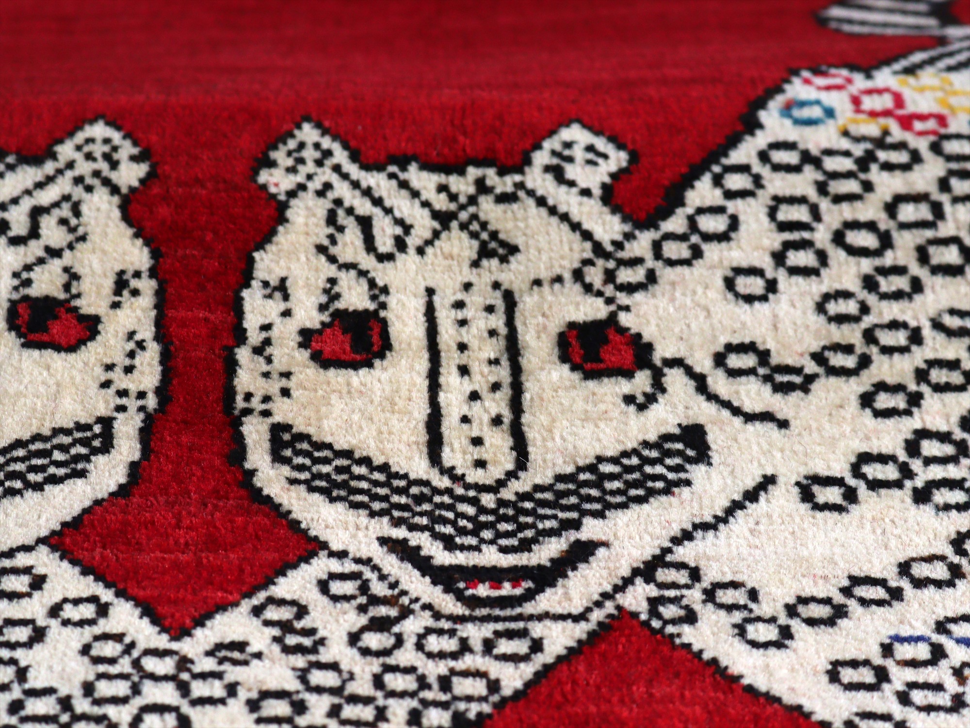 愛嬌のある表情の白いヒョウが4匹が中央に向かって描かれ、中央にはオオカミのようにも見えるヒョウ(おそらく)が配置されています。デザインの意味するところは調べてもなかなかわからないのですが、4匹のヒョウのギャッベは当店ではこれまでに8枚の取扱いがあり、そのうちの5枚に同じように中央に違う表現のヒョウが織られています。ある年代に流行したデザインだったのだろうと推測されます。