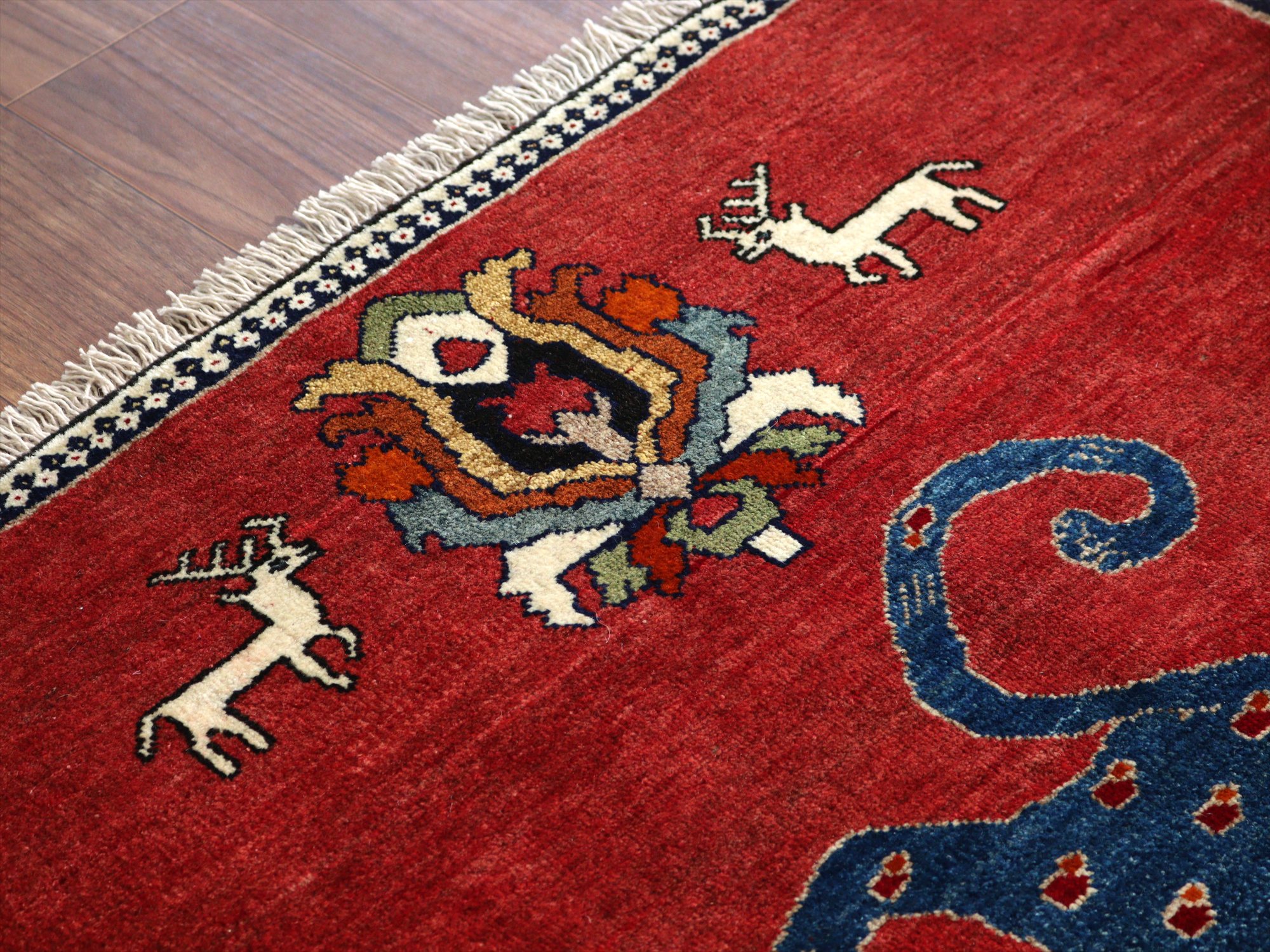 カシュカイ族の象徴でもあるライオンとともに、よく登場する豹のデザイン(メスのライオンとも言われています)。中央に1頭がシンプルに織り込まれるデザインが多い中、このギャッベはヒョウの上下にパルメットと白い鹿が織り込まれたユニークな配置です。絨毯として縦にも横にも使えそうです。