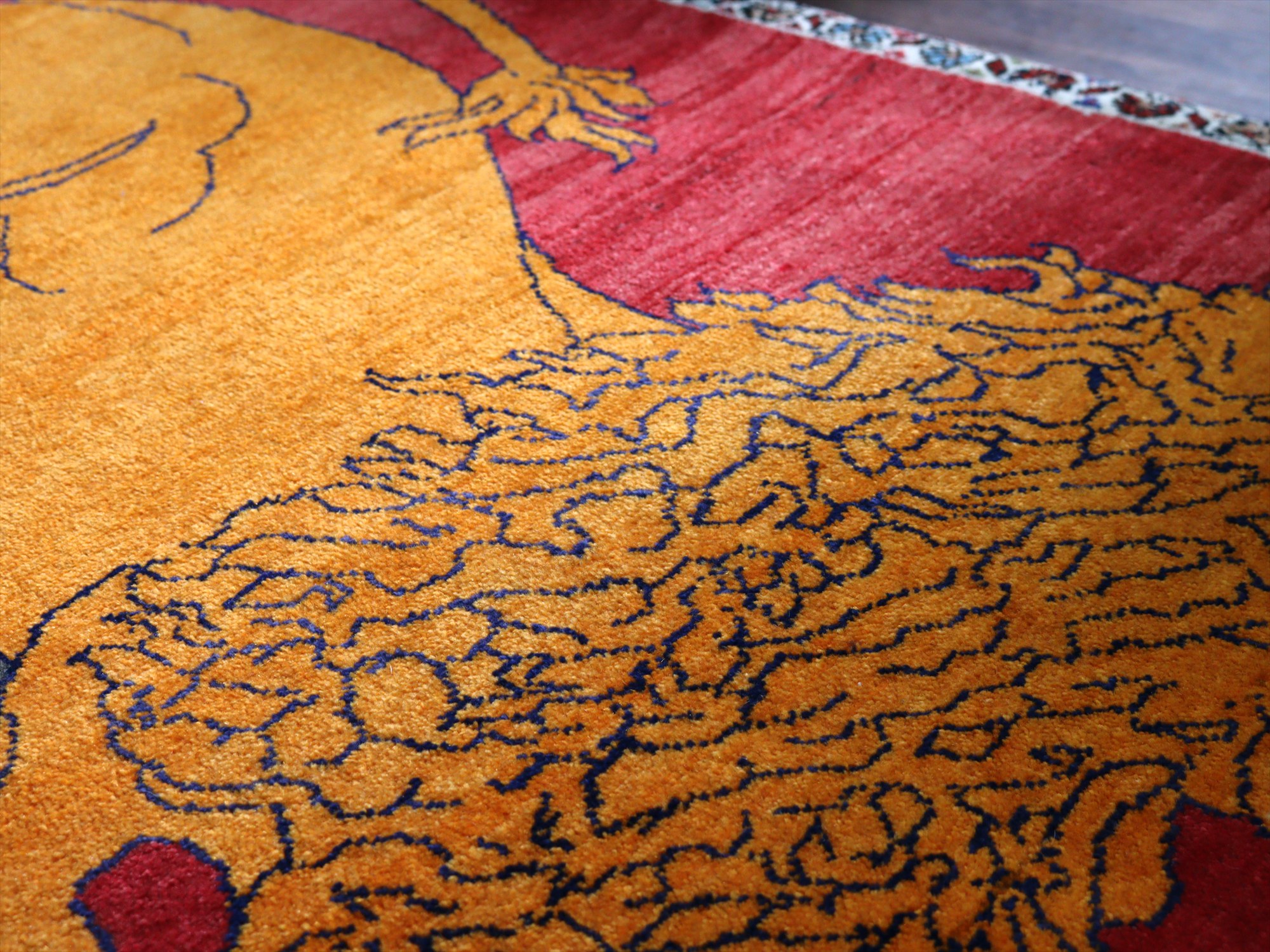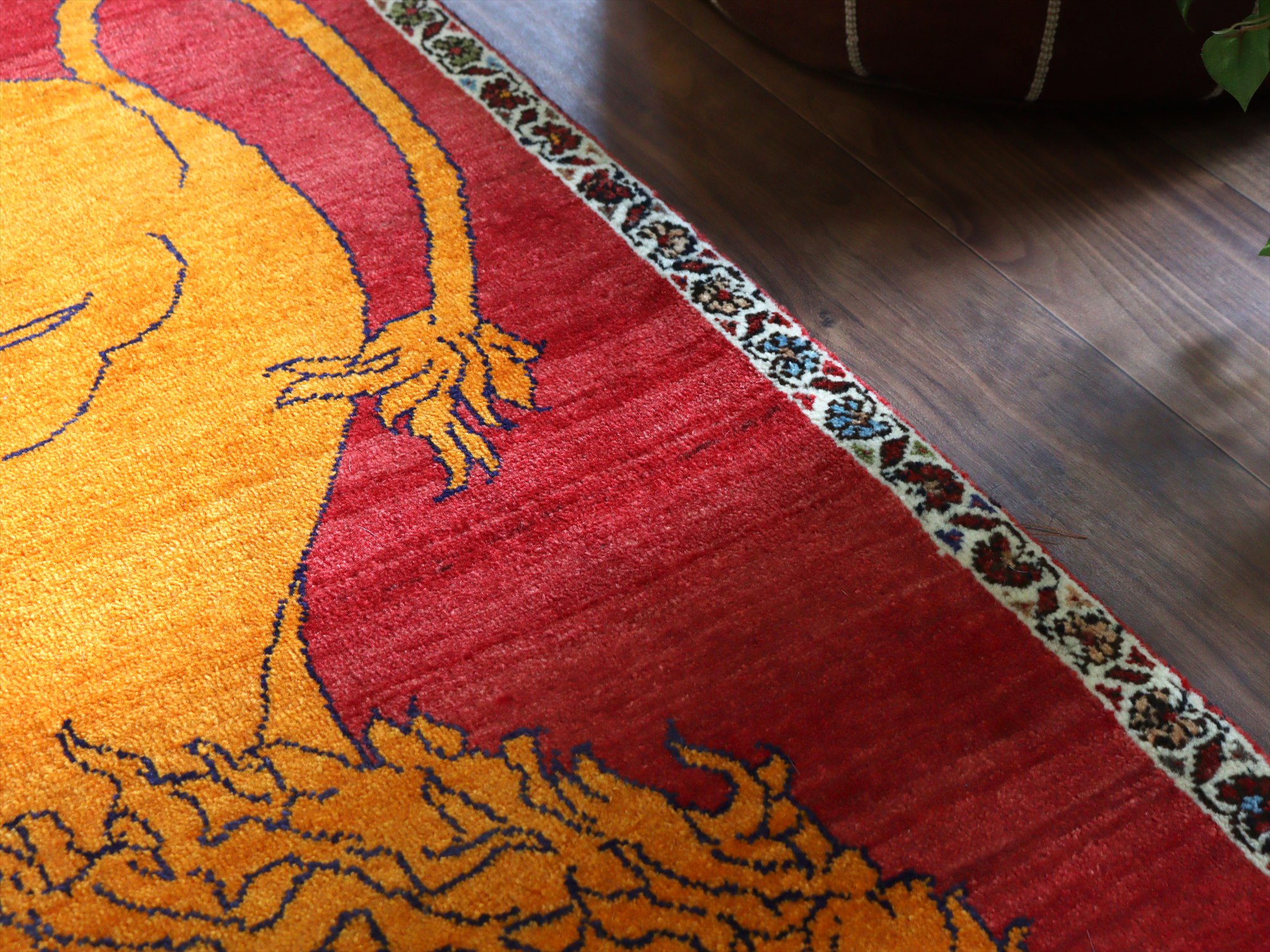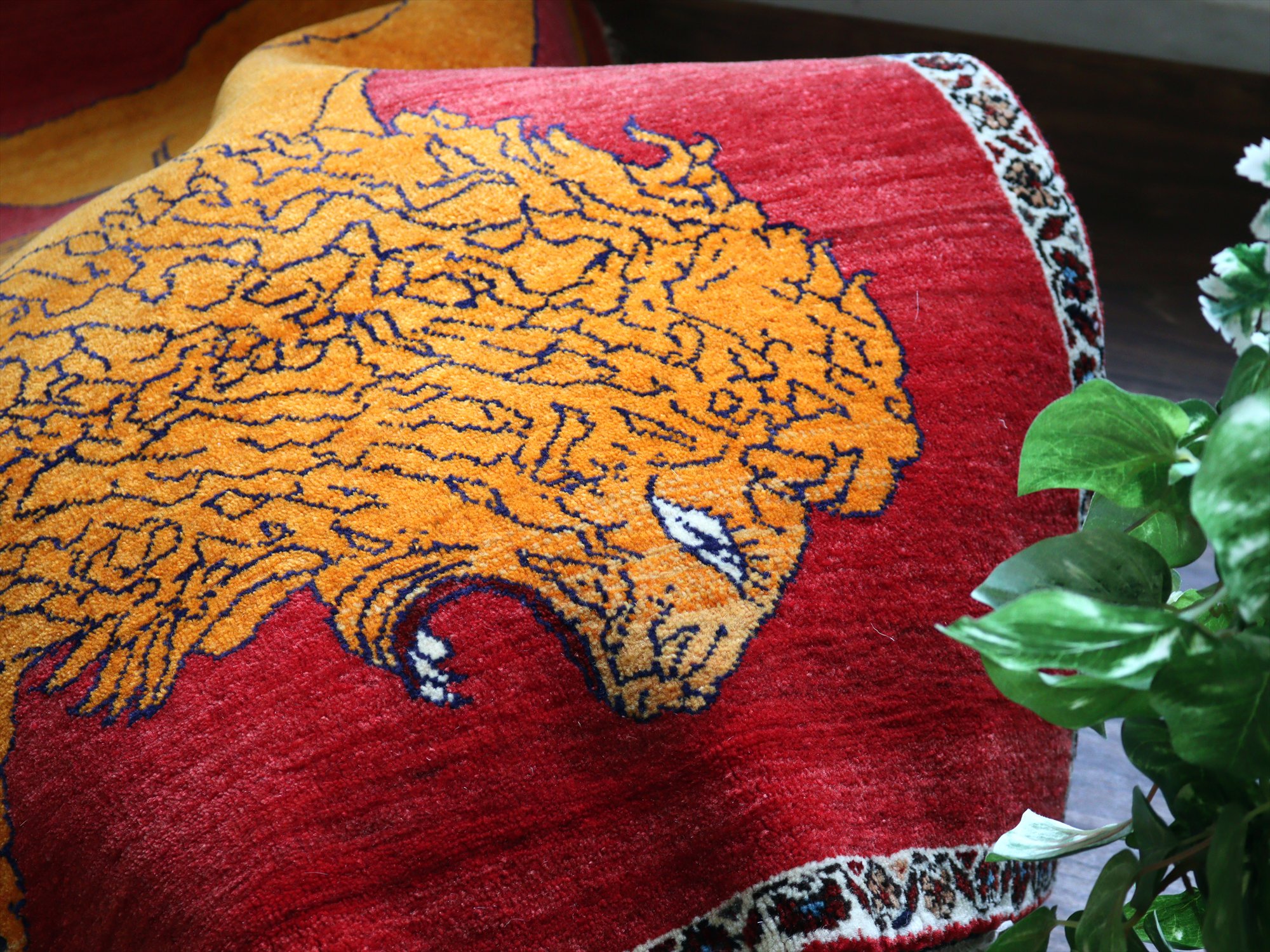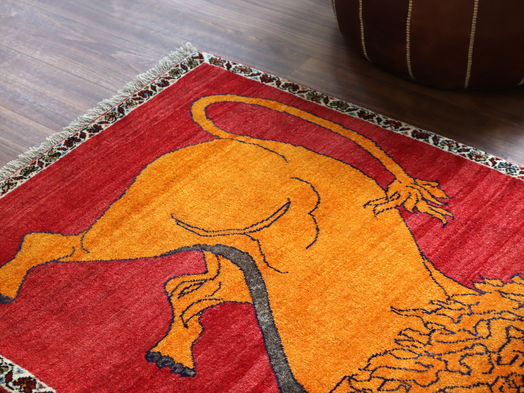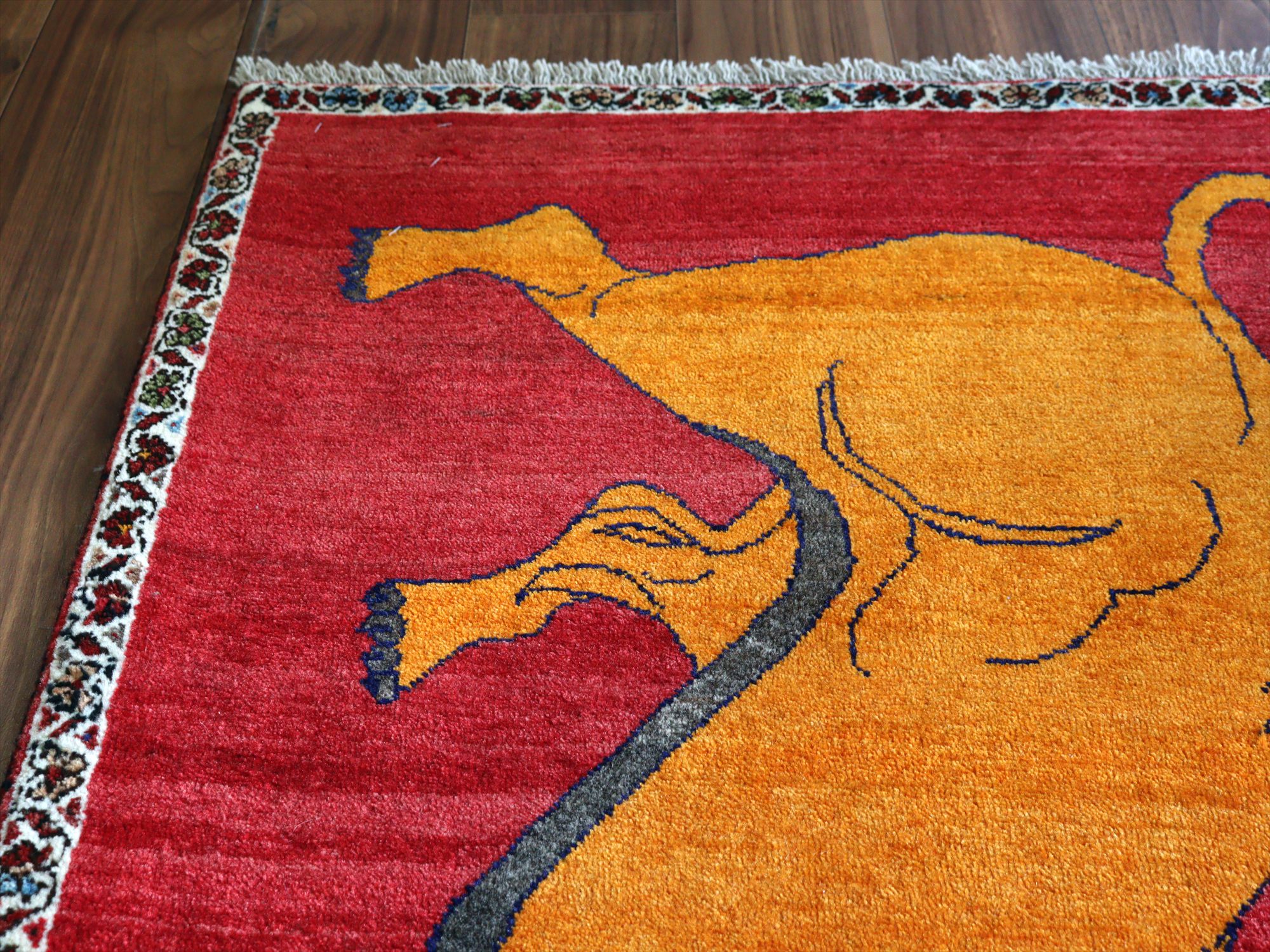 カシュカイ族の象徴ともされるライオンのデザインを現代になって織ったものです。一見リアルなライオンですがよく見るとかなりデフォルメされていて、上に伸びた尻尾と太く短い脚の表現がカシュカイ族のライオンギャッベの特徴をよくあらわしているピースです。