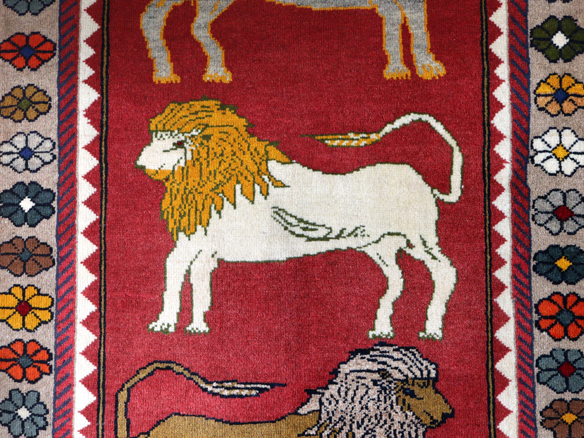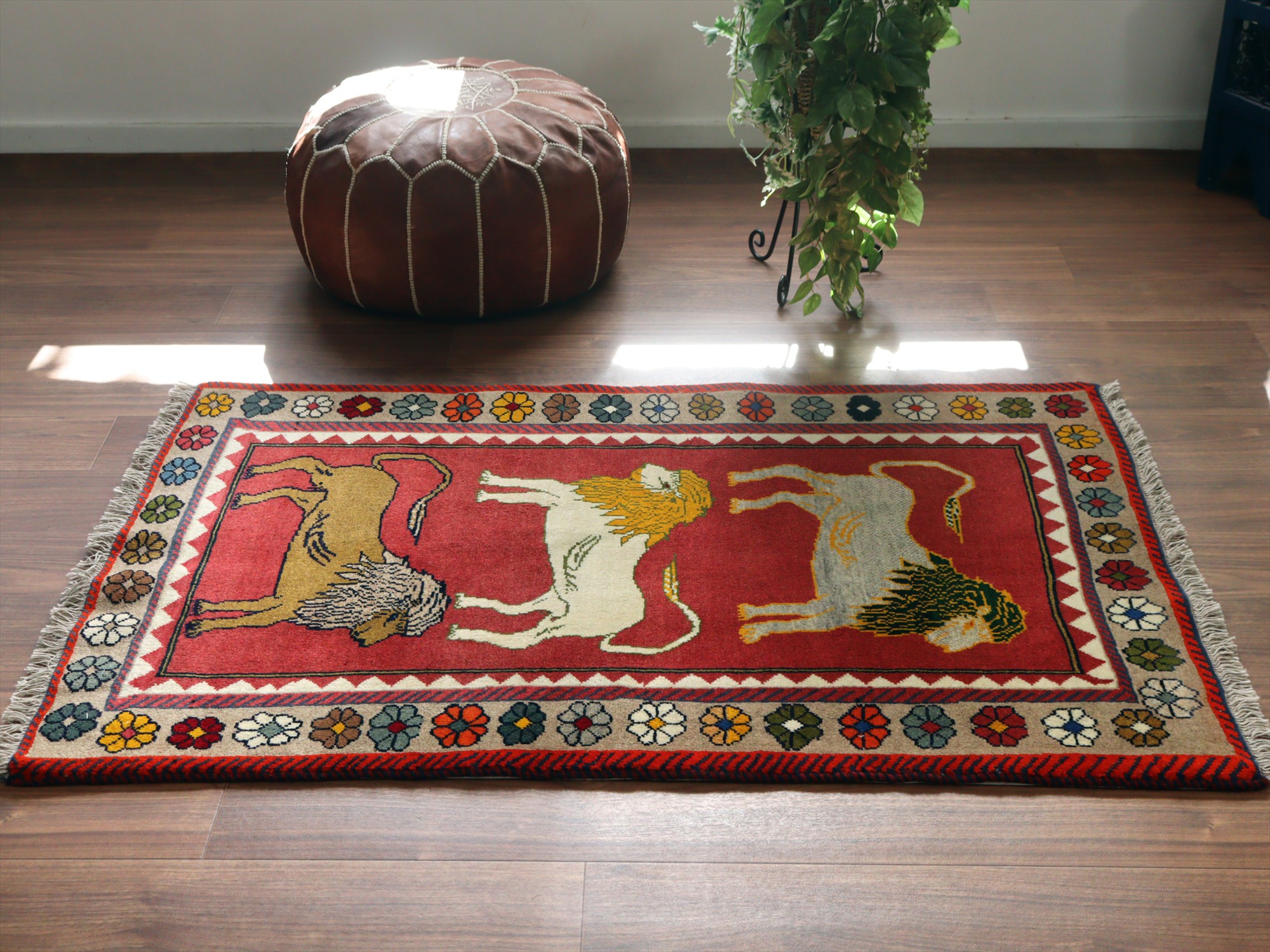 ライオンラグ 手織りギャッベ 137x88cm 3頭のライオンと小花
