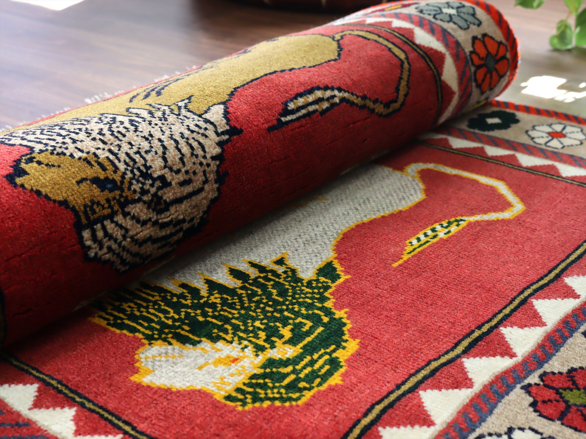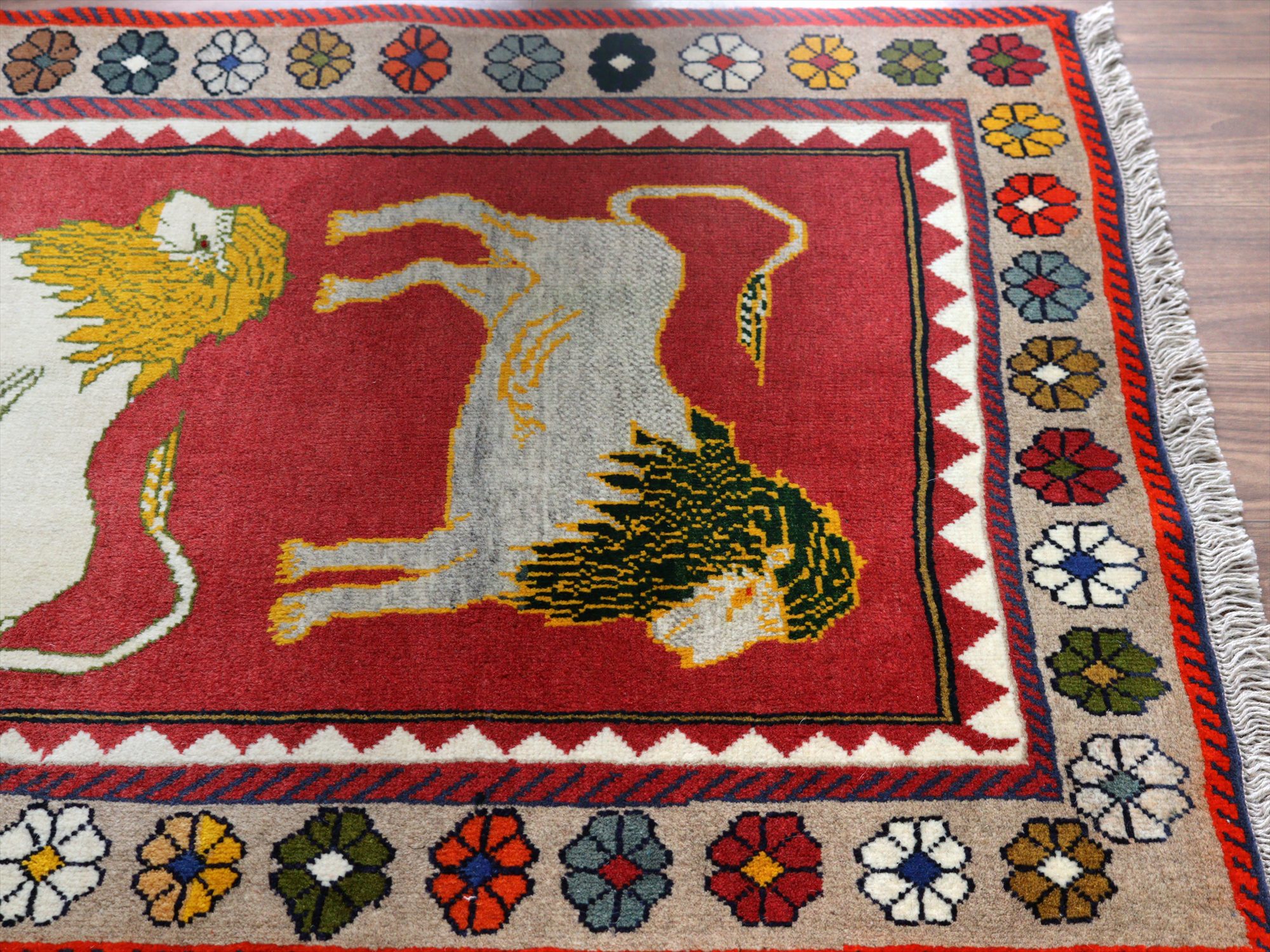 - ライオンラグ 手織りギャッベ 137x88cm 3頭のライオンと小花