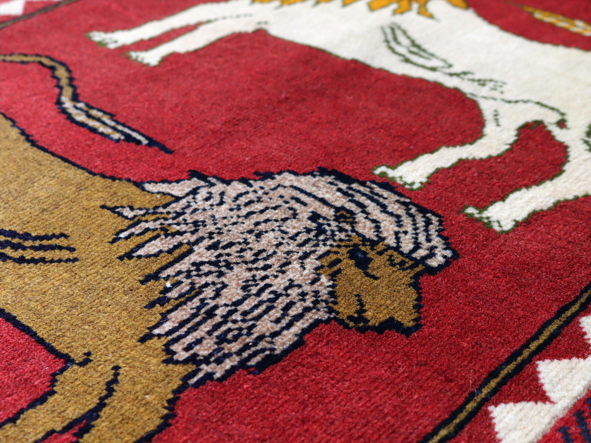 カシュカイ族の象徴とされるライオンのモチーフですが、実際にはすでに絶滅してしまったライオンの姿を想像しながら、織り継がれてきたといいます。オールドライオンギャッベは、もともと販売のためではなく遊牧民たちが自分たちでテント(または部屋)で使うために織られたもの。生活の中で使用されていたものもあれば大切に保管してあったものもあり、状態は様々です。