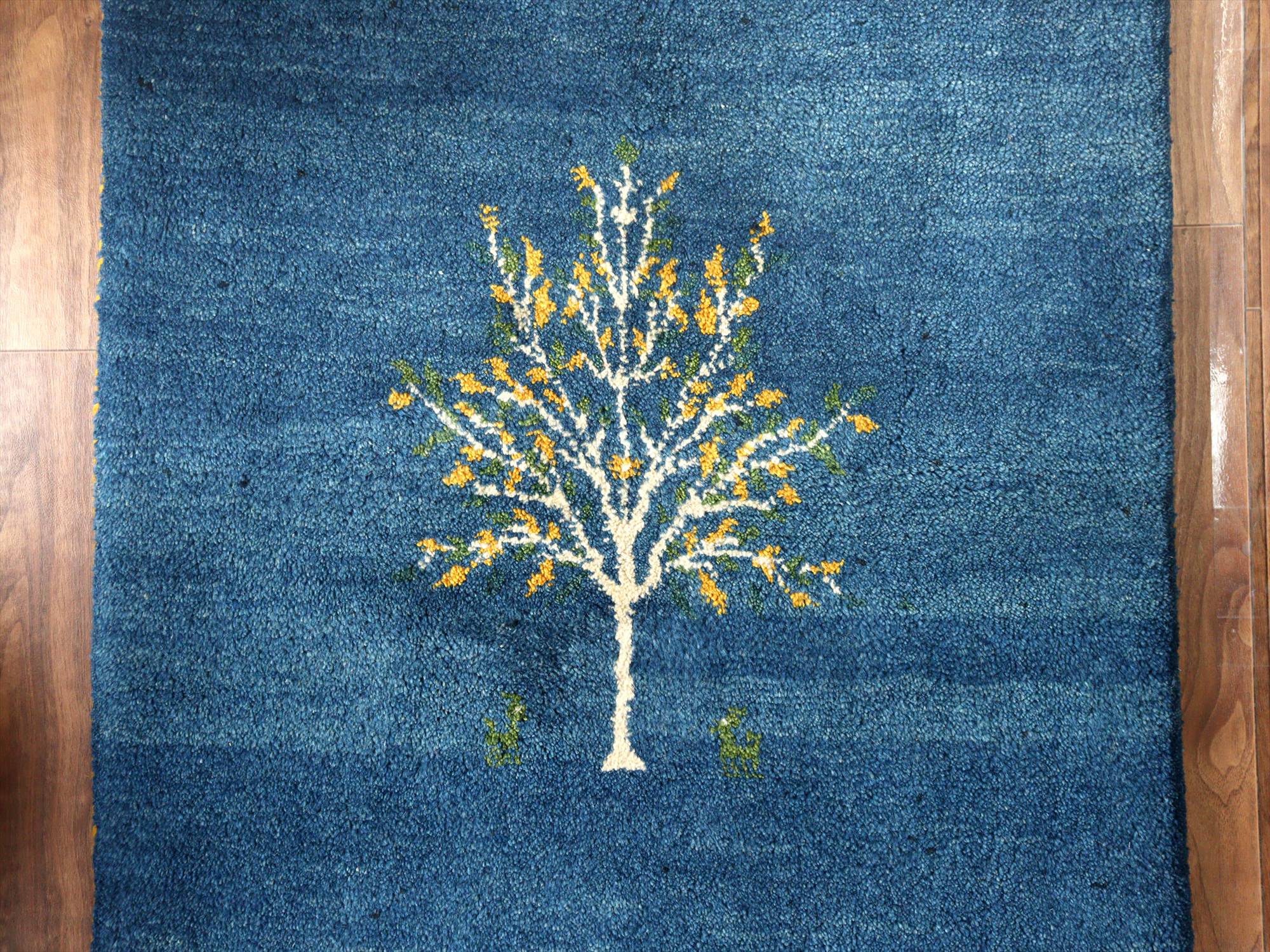 イランの手織りラグ ギャッベ 120x80cm 植物と動物 ブルー