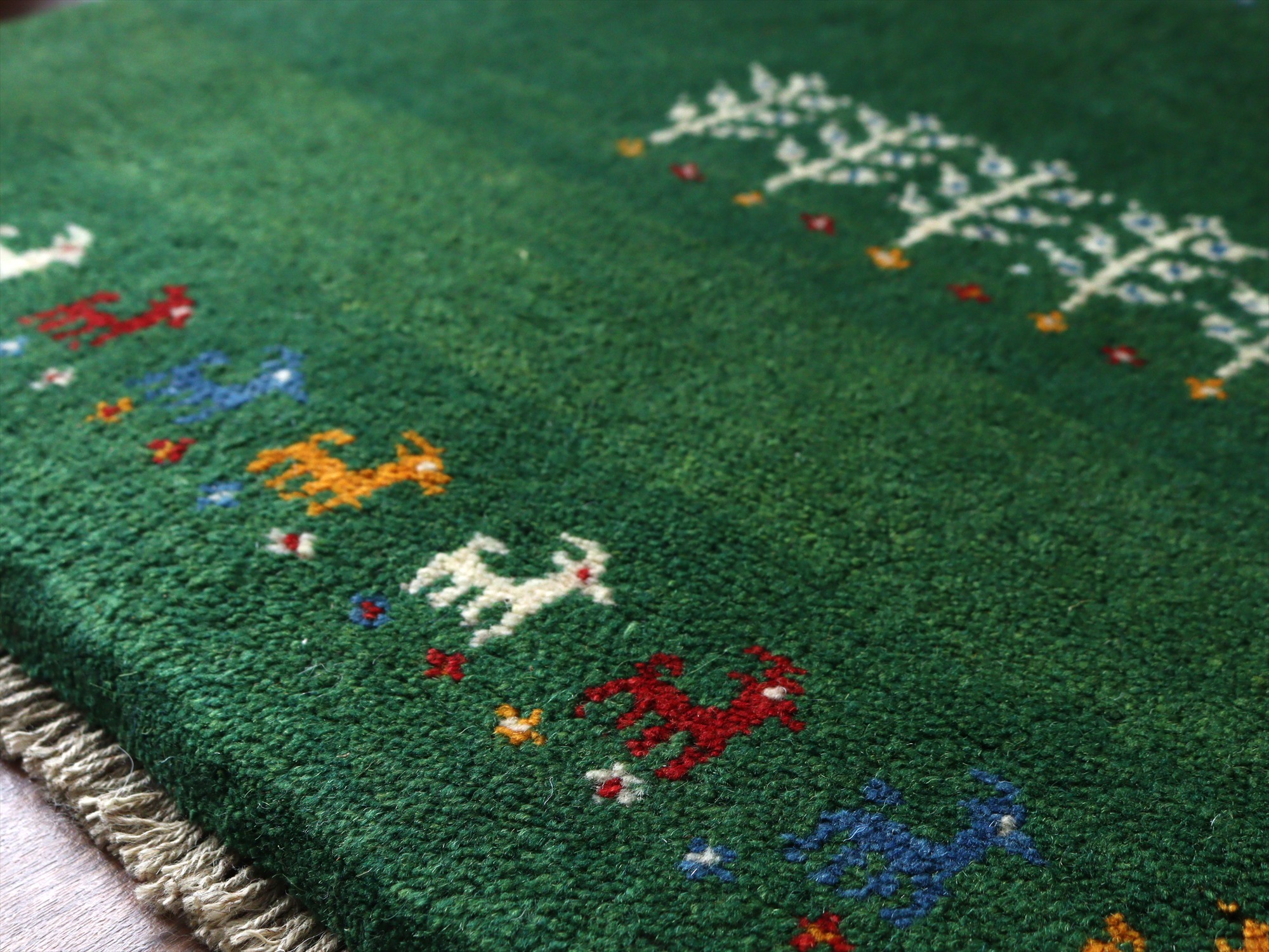 - イランの手織りラグ ギャッベ 114x81cm グリーン 動物と生命の樹