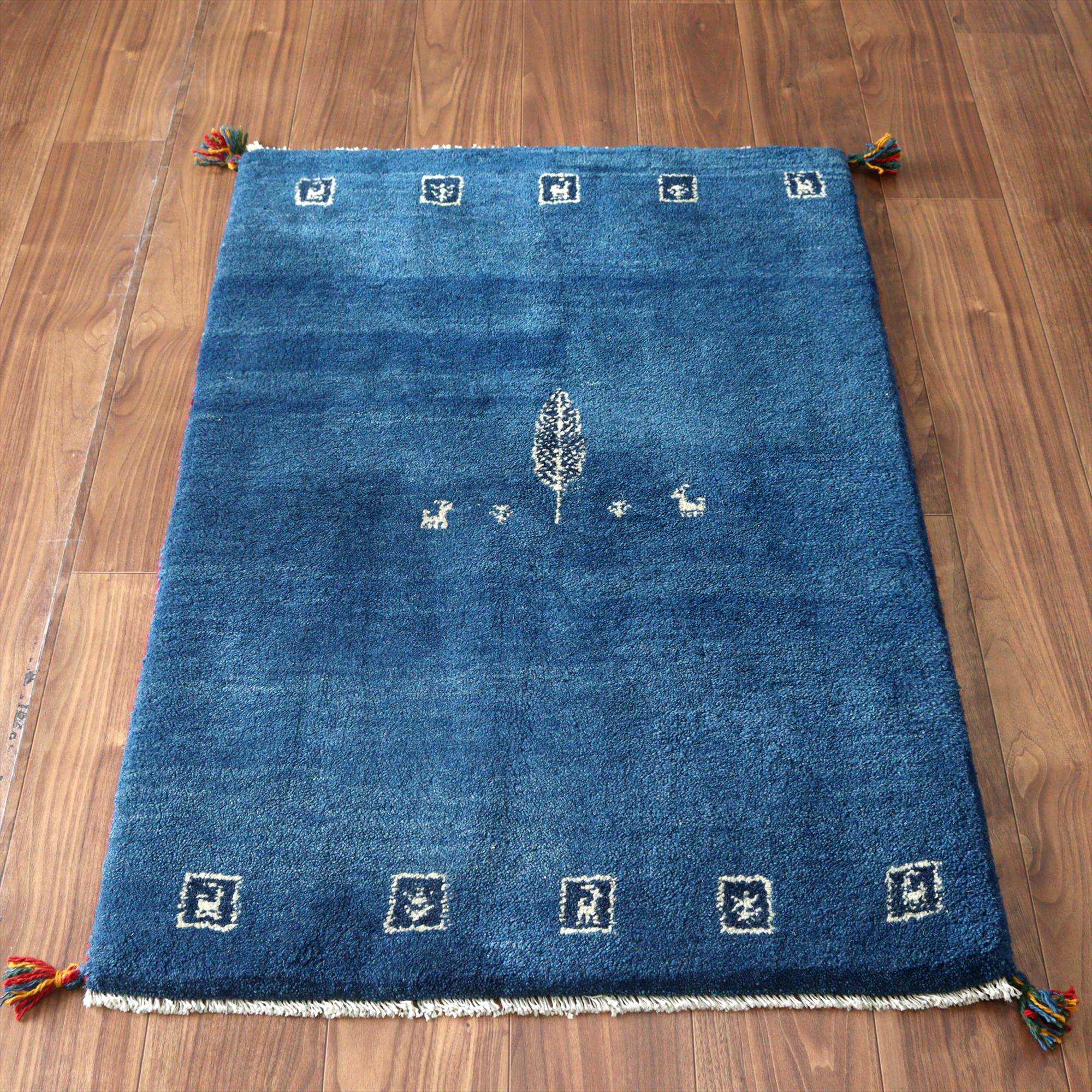 - イランの手織りラグ ギャッベ 118x80cm 動物と植物 ブルー