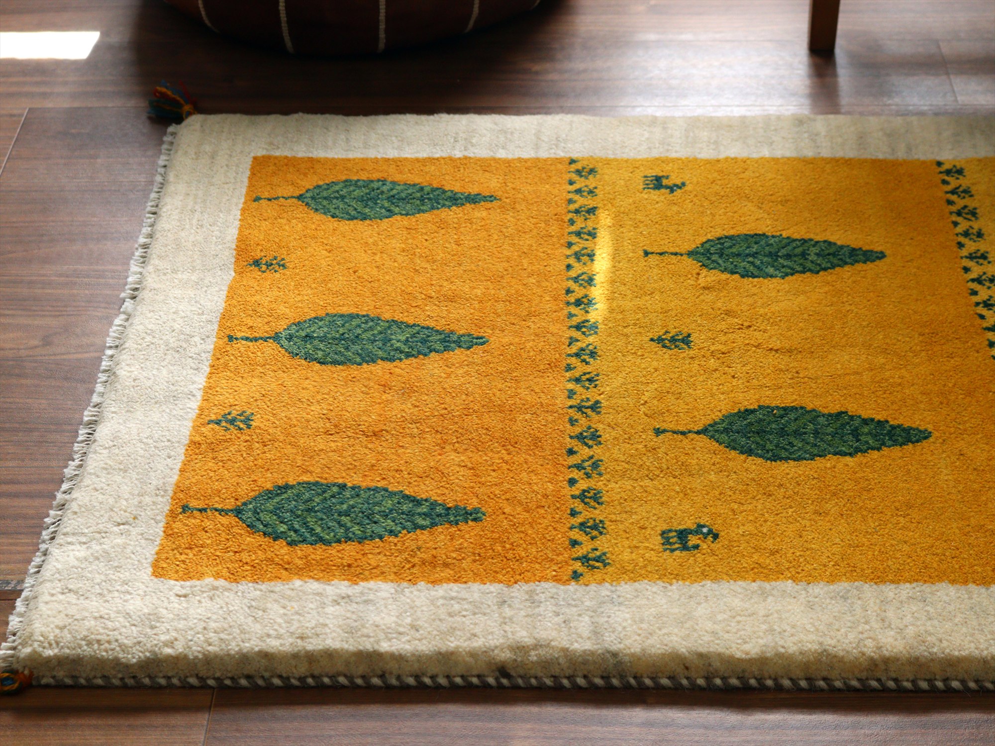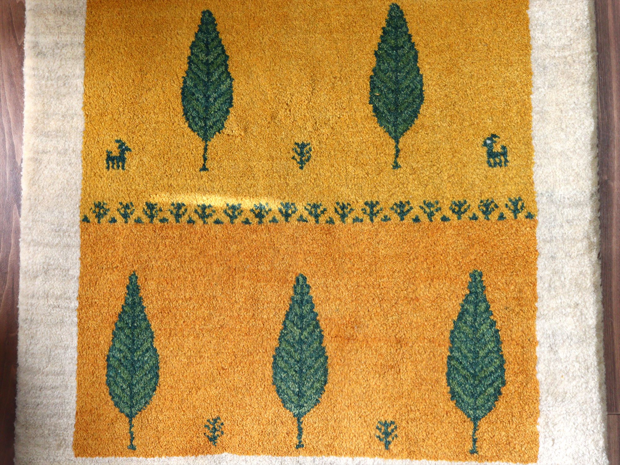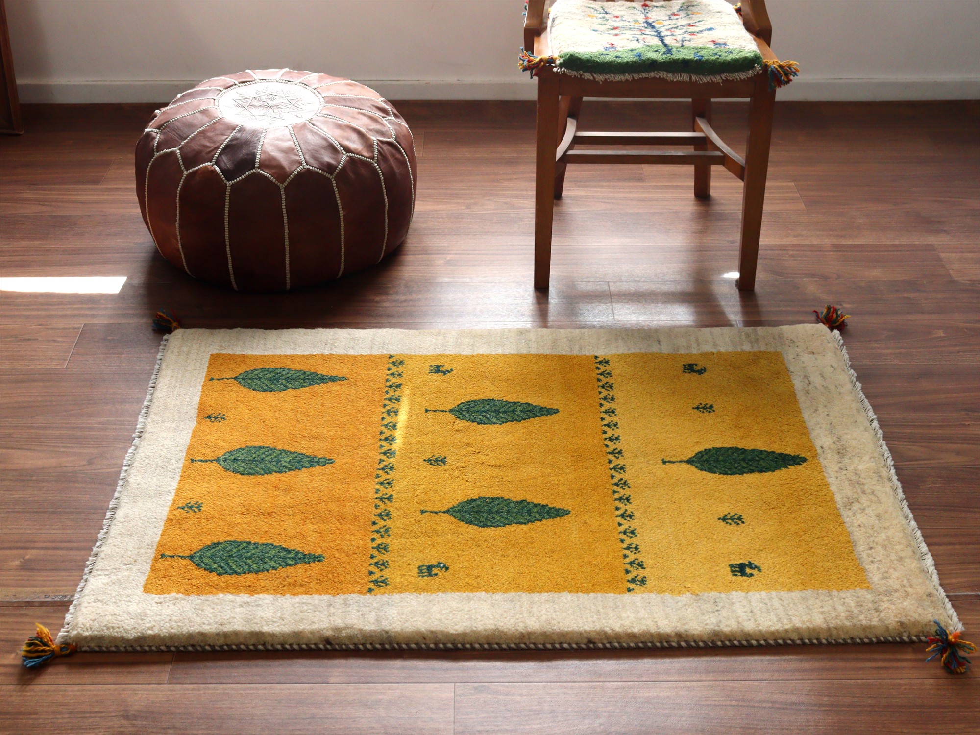 ギャッベ イランの手織りラグ 123x82cm 糸杉の樹 イエロー&アイボリー