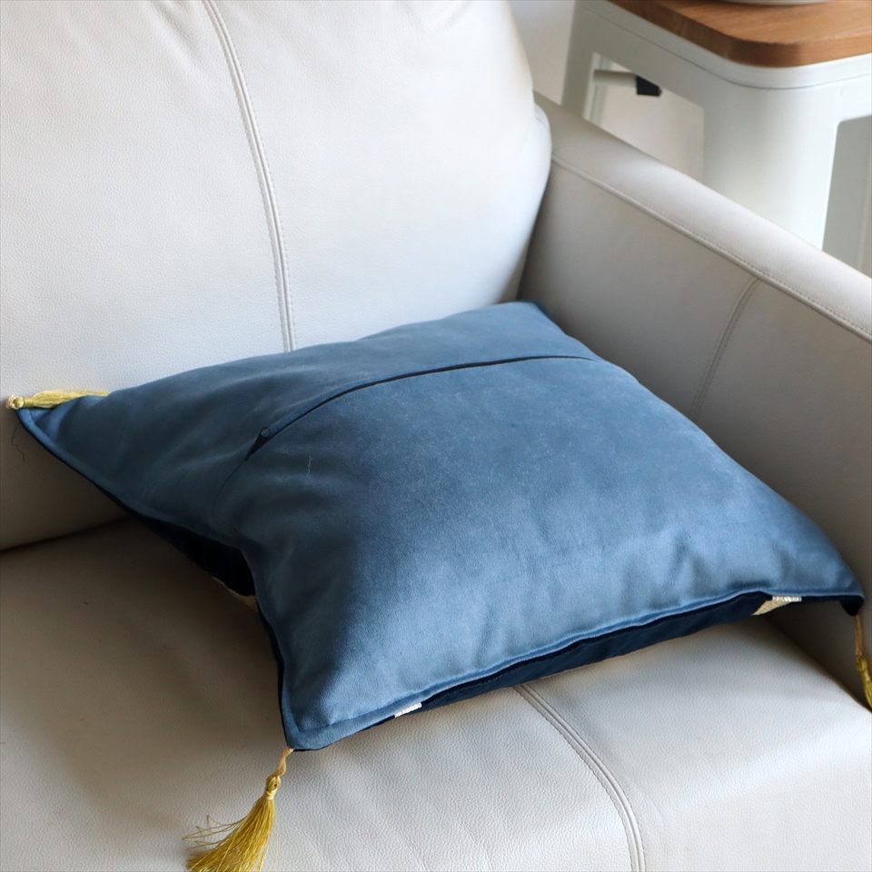 四隅には、抑えた色合いのゴールドのフリンジが付いています。モザイクに使われる生地は一枚一枚異なっていて、さまざまな表情が楽しめるのも魅力です。