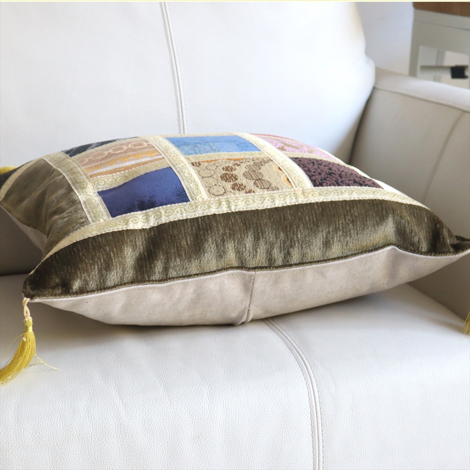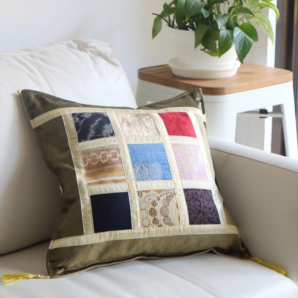 四隅には、抑えた色合いのゴールドのフリンジが付いています。モザイクに使われる生地は一枚一枚異なっていて、さまざまな表情が楽しめるのも魅力です。