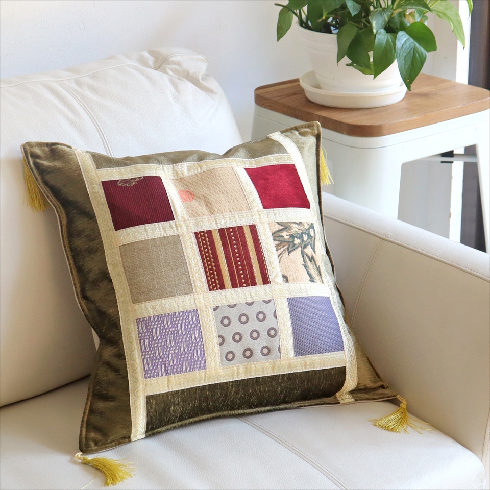 四隅には、抑えた色合いのゴールドのフリンジが付いています。モザイクに使われる生地は一枚一枚異なっていて、さまざまな表情が楽しめるのも魅力です。