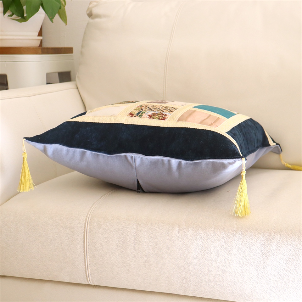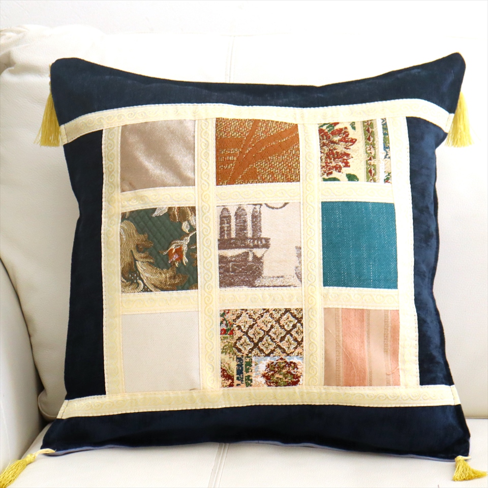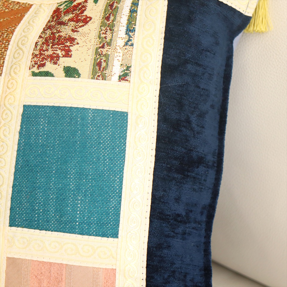四隅には、抑えた色合いのゴールドのフリンジが付いています。モザイクに使われる生地は一枚一枚異なっていて、さまざまな表情が楽しめるのも魅力です。