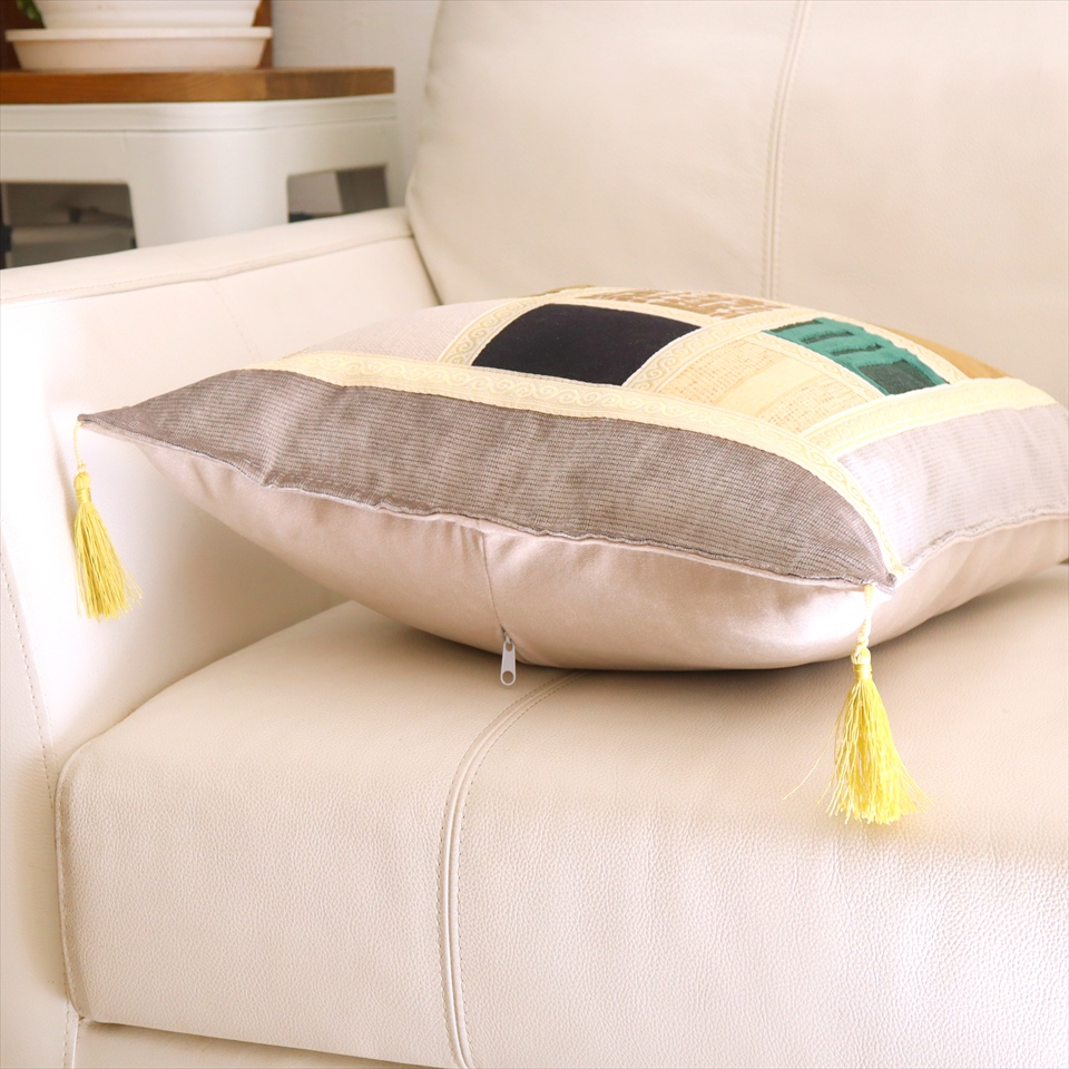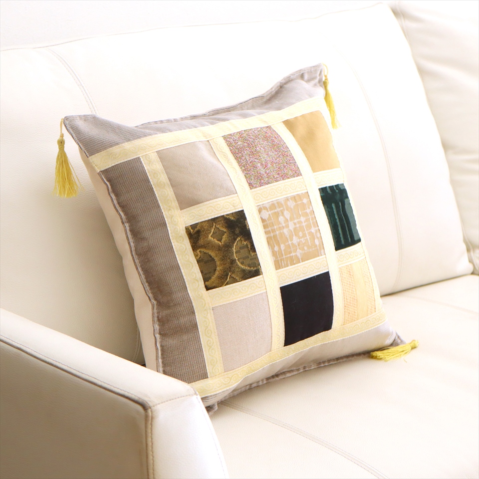 四隅には、抑えた色合いのゴールドのフリンジが付いています。モザイクに使われる生地は一枚一枚異なっていて、さまざまな表情が楽しめるのも魅力です。