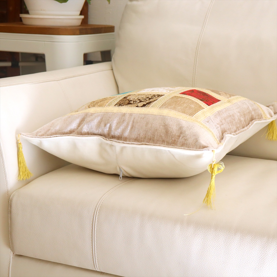 四隅には、抑えた色合いのゴールドのフリンジが付いています。モザイクに使われる生地は一枚一枚異なっていて、さまざまな表情が楽しめるのも魅力です。