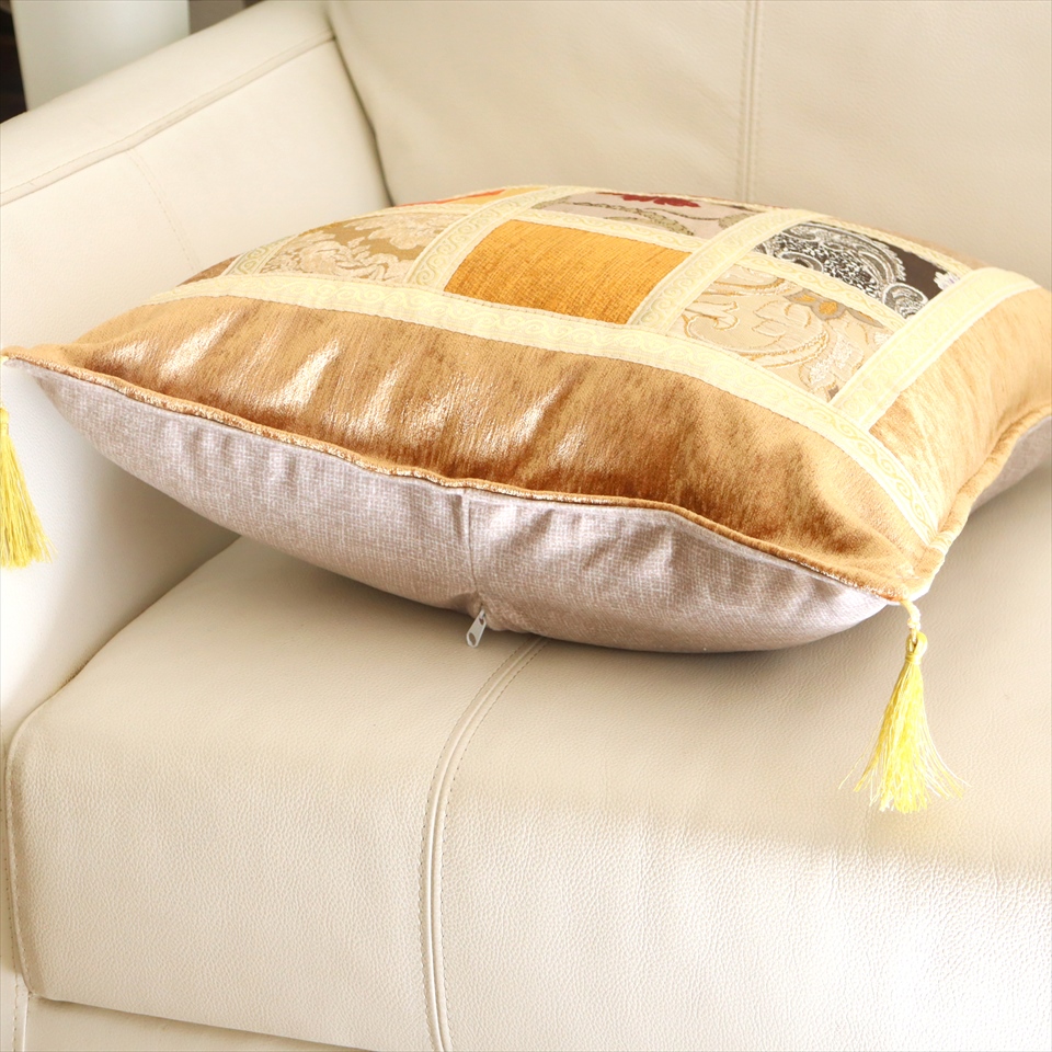 四隅には、抑えた色合いのゴールドのフリンジが付いています。モザイクに使われる生地は一枚一枚異なっていて、さまざまな表情が楽しめるのも魅力です。