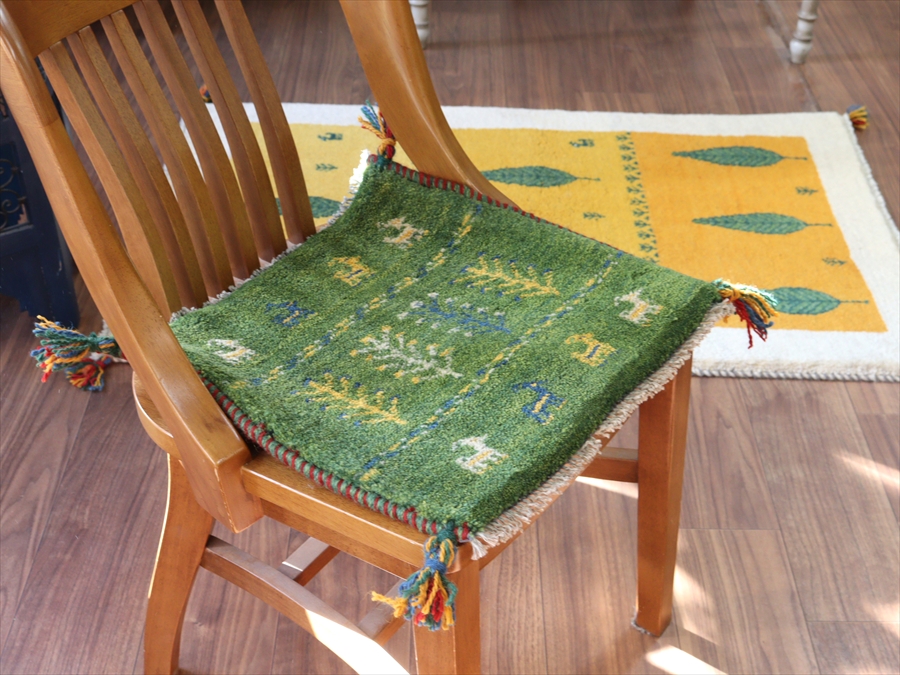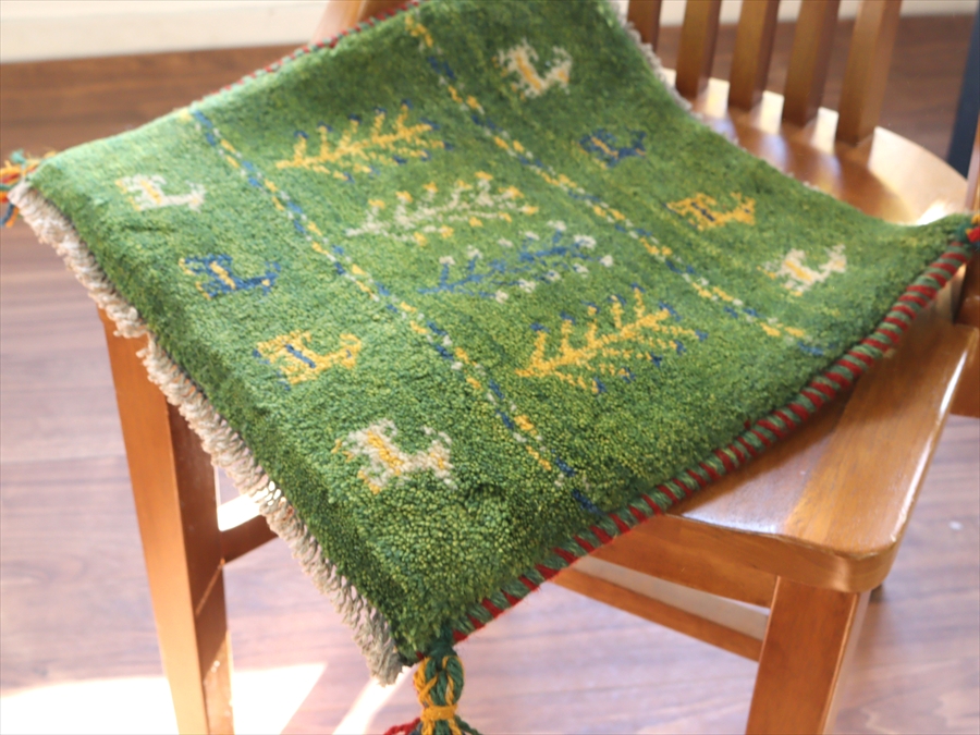 - ギャッベ イラン産手織り 座布団サイズ 39x43cm 明るいグリーン