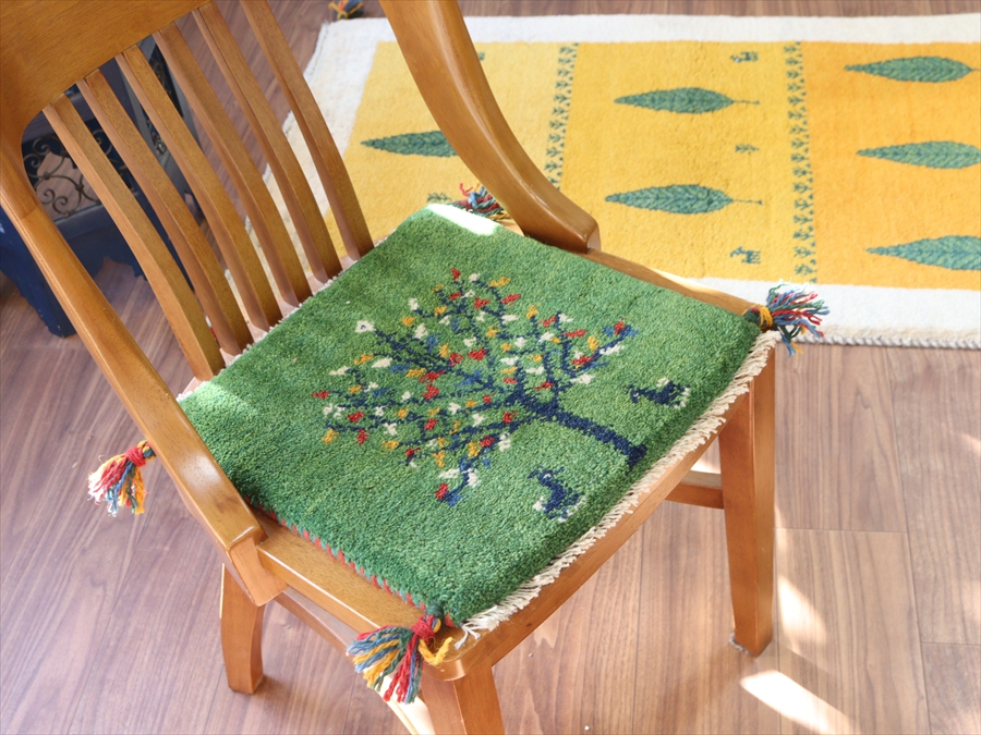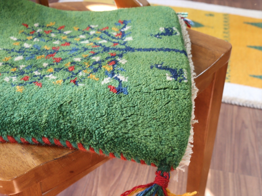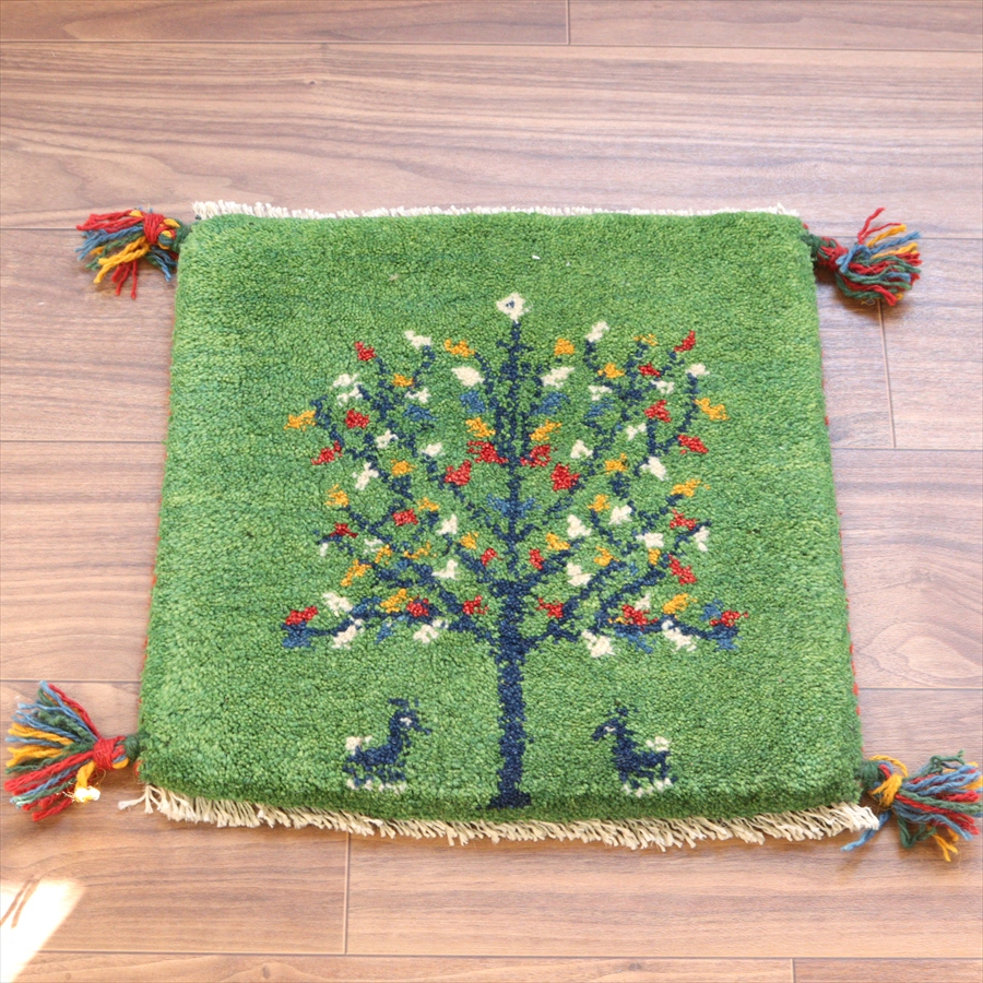 ギャッベ イラン産手織り 座布団サイズ 39x39cm グリーン 花をつけた生命の木