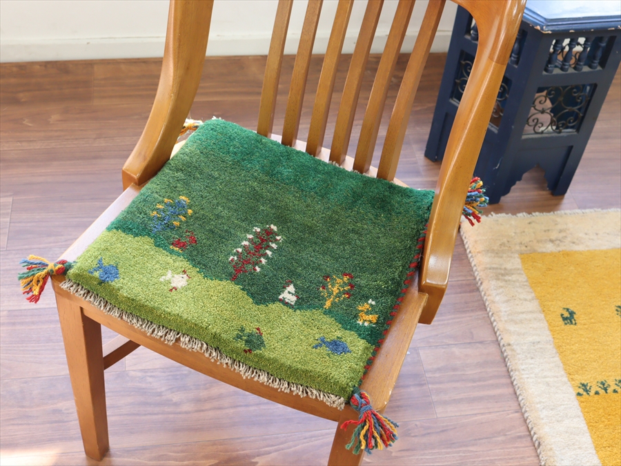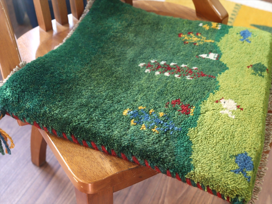 Key:イラン直輸入, GABBEH, ギャッベ, ギャベ, グリーン, 緑, 手織り, 手紡ぎ, ウール, 天然素材, ポンポン, 座布団, バザールギャッベ, ハンドメイド, 一点もの, 現品販売,ガラタバザール, 東京中野区