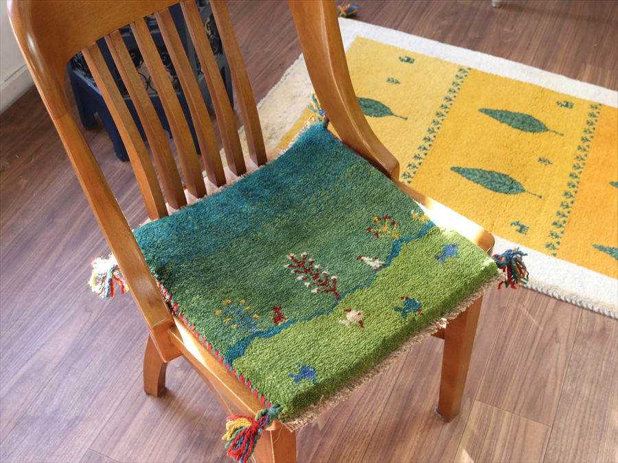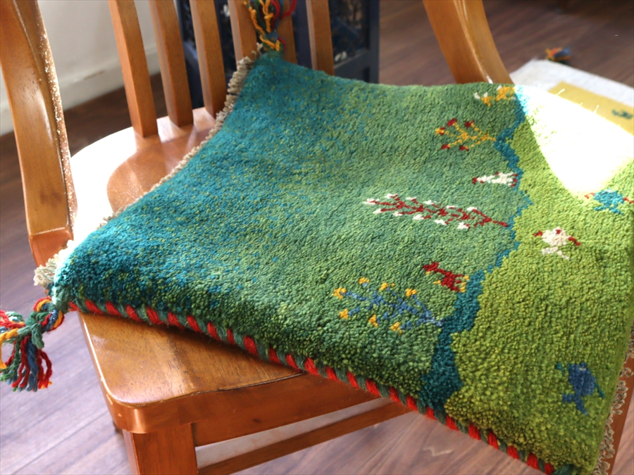 ギャッベ イラン産手織り 座布団サイズ 39x40cm グリーングラデーション 魚のいる湖