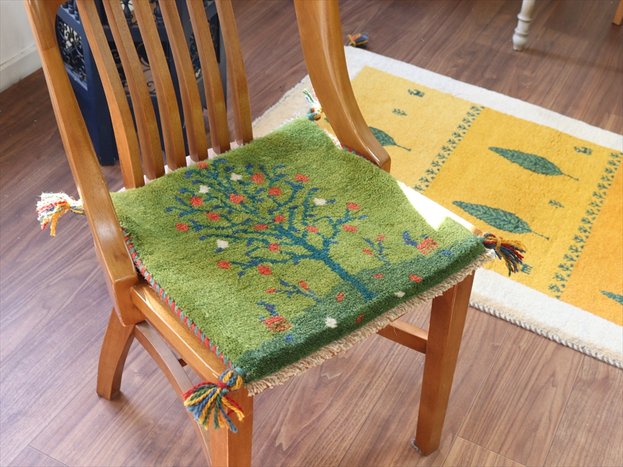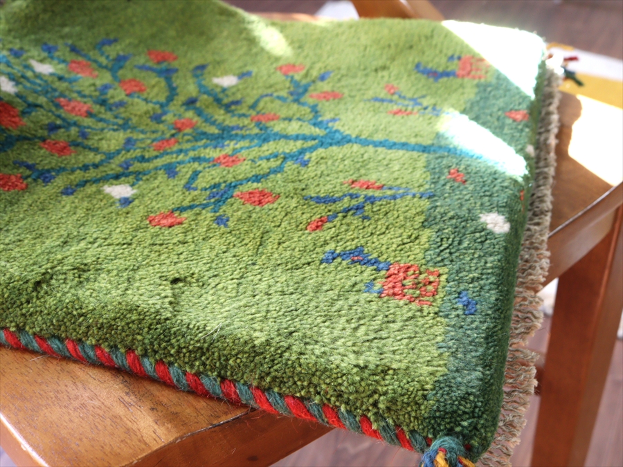 ギャッベ イラン産手織り 座布団サイズ 40x41cm グリーン ザクロの実をつけた生命の木