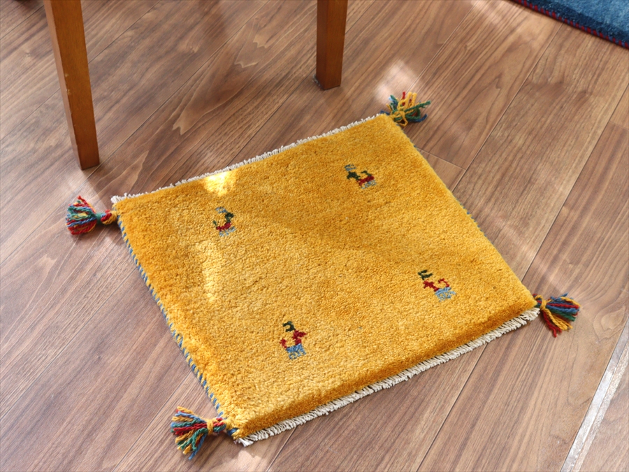 ギャッベ イラン産手織り 座布団サイズ 40x47cm イエローオレンジ シンプル 無地 動物モチーフ
