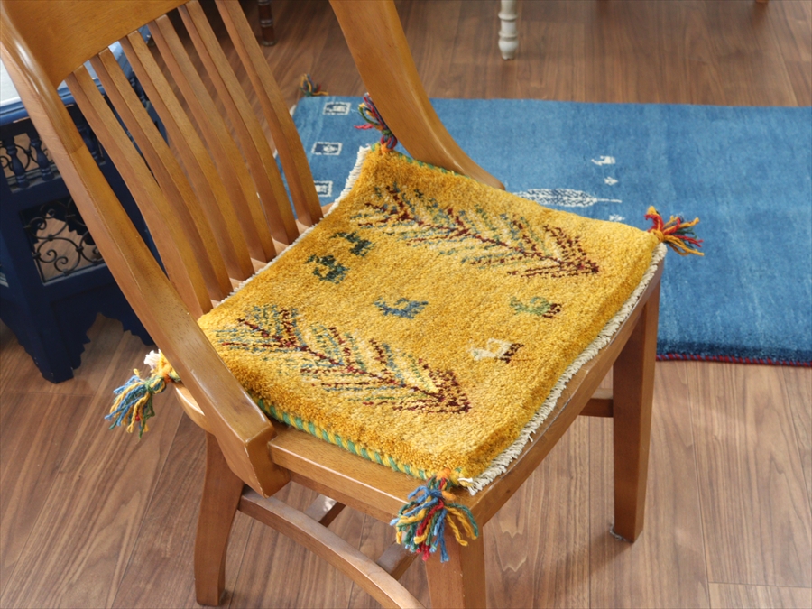何枚も集めたくなる、40cm角の座布団サイズギャベ。四隅に大きなポンポンのついた、伝統的なスタイルでおられています。フローリングに並べて座布団がわりに使ったり、ベンチやダイニングチェアの座面など、使い方はいろいろ。壁にタペストリーのように飾るのもおすすめです。