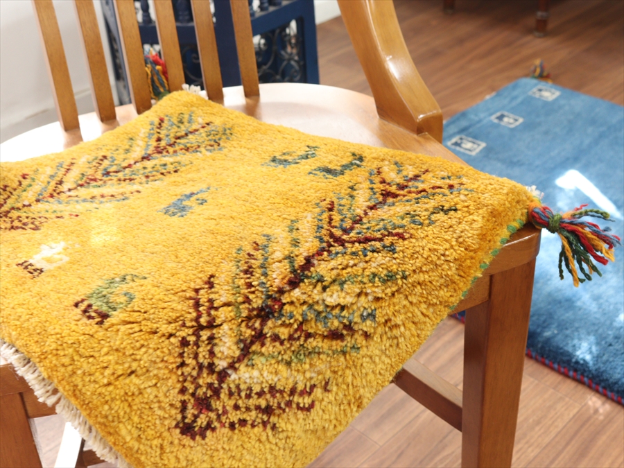 ギャッベ イラン産手織り 座布団サイズ 37x42cm イエロー 生命の木と動物たち