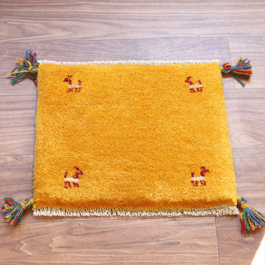 - ギャッベ イラン産手織り 座布団サイズ 35x42cm イエローオレンジ シンプル 無地 動物モチーフ