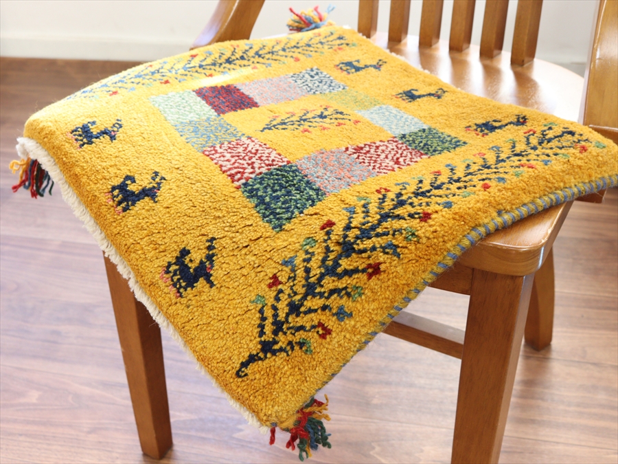ギャッベ イラン産手織り 座布団サイズ 40x45cm イエロー 寒色系のタイルモチーフ 生命の木